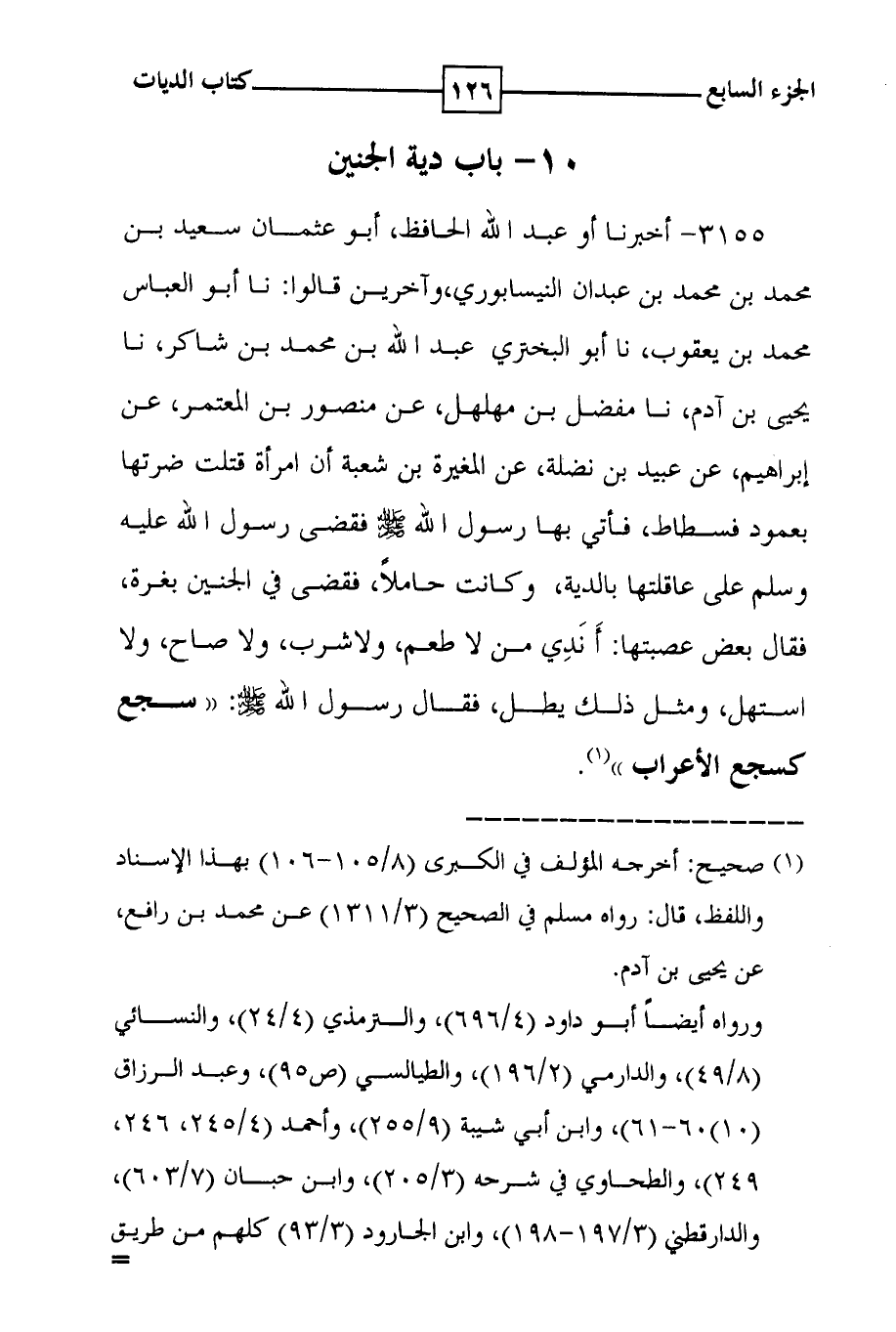 3155 - أخبرنا أبو عبد الله الحافظ ، أبو عثمان سعيد بن محمد بن محمد بن عبدان النيسابوري ، وآخرين قالوا : نا أبو العباس محمد بن يعقوب ، نا أبو البختري عبد الله بن محمد بن شاكر ، نا يحيى بن آدم ، نا مفضل بن مهلهل ، عن منصور بن المعتمر ، عن إبراهيم ، عن عبيد بن نضلة ، عن المغيرة بن شعبة أن امرأة قتلت ضرتها بعمود فسطاط ، فأتي بها رسول الله صلى الله عليه وسلم فقضى رسول الله عليه وسلم على عاقلتها بالدية ، وكانت حاملاً ، فقضى في الجنين بغرة ، فقال بعض عصبتها : أندي من لا طعم ، ولا شرب ، ولا صاح ، ولا استهل ، ومثل ذلك يطل ، فقال رسول الله صلى الله عليه وسلم : ' سجع كسجع الأعراب ' ( 1 ) .