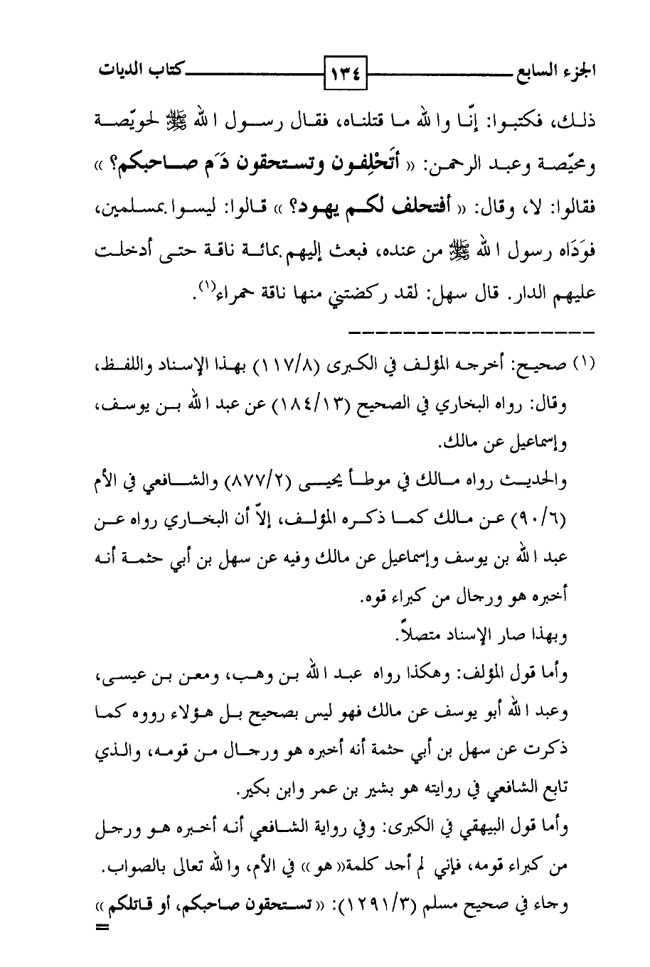 ذلك ، فكتبوا : إنا والله ما قتلناه ، فقال رسول الله صلى الله عليه وسلم لحويصة ومحيصة وعبد الرحمن ، ( ( اتحلفون وتستحقون دم صاحبكم ؟ ) ) فقالوا : لا ، وقال : ( ( أفتحلف لكم يهود ؟ ) ) قالوا : ليسوا بمسلمين ، فوداه رسول الله صلى الله عليه وسلم من عنده ، فبعث إليهم بمائة ناقة حتى أدخلت عليهم الدار . قال سهل : لقد ركضتني منها ناقة حمراء ( 1 ) .