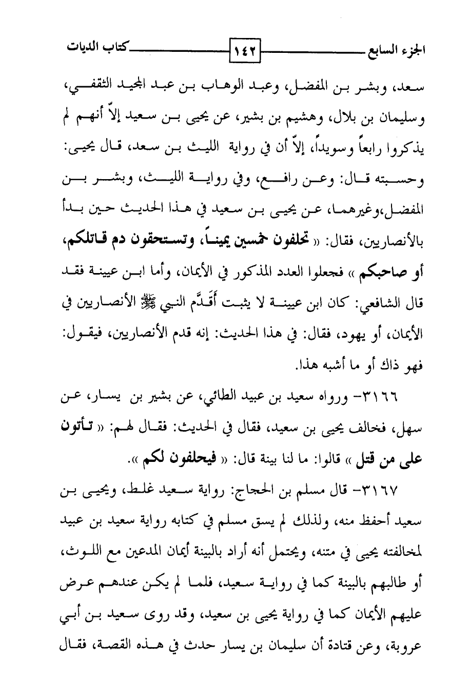 سعد ، وبشر بن المفضل ، وعبد الوهاب بن عبد المجيد الثقفي ، وسليمان بن بلال ، وهشيم بن بشير ، عن يحيى بن سعيد إلا أنهم لم يذكروا رابعاً وسويداً ، إلا أن في رواية الليث بن سعد ، قال يحيى : وحسبته قال : وعن رافع ، وفي رواية الليث ، وبشر بن المفضل ، وغيرهما ، عن يحيى بن سعيد في هذا الحديث حين بدأ بالأنصاريين ، فقال : ( ( تحلفون خمسين يميناً ، وتستحقون دم قاتلكم ، أو صاحبكم ) ) فجعلوا العدد المذكور في الأيمان ، وأما ابن عيينة فقد قال الشافعي : كان ابن عيينة لا يثبت أقدم النبي صلى الله عليه وسلم الأنصاريين في الأيمان ، أو يهود ، فقال : في هذا الحديث : إنه قدم الأنصاريين ، فيقول : فهو ذاك أو ما أشبه هذا .