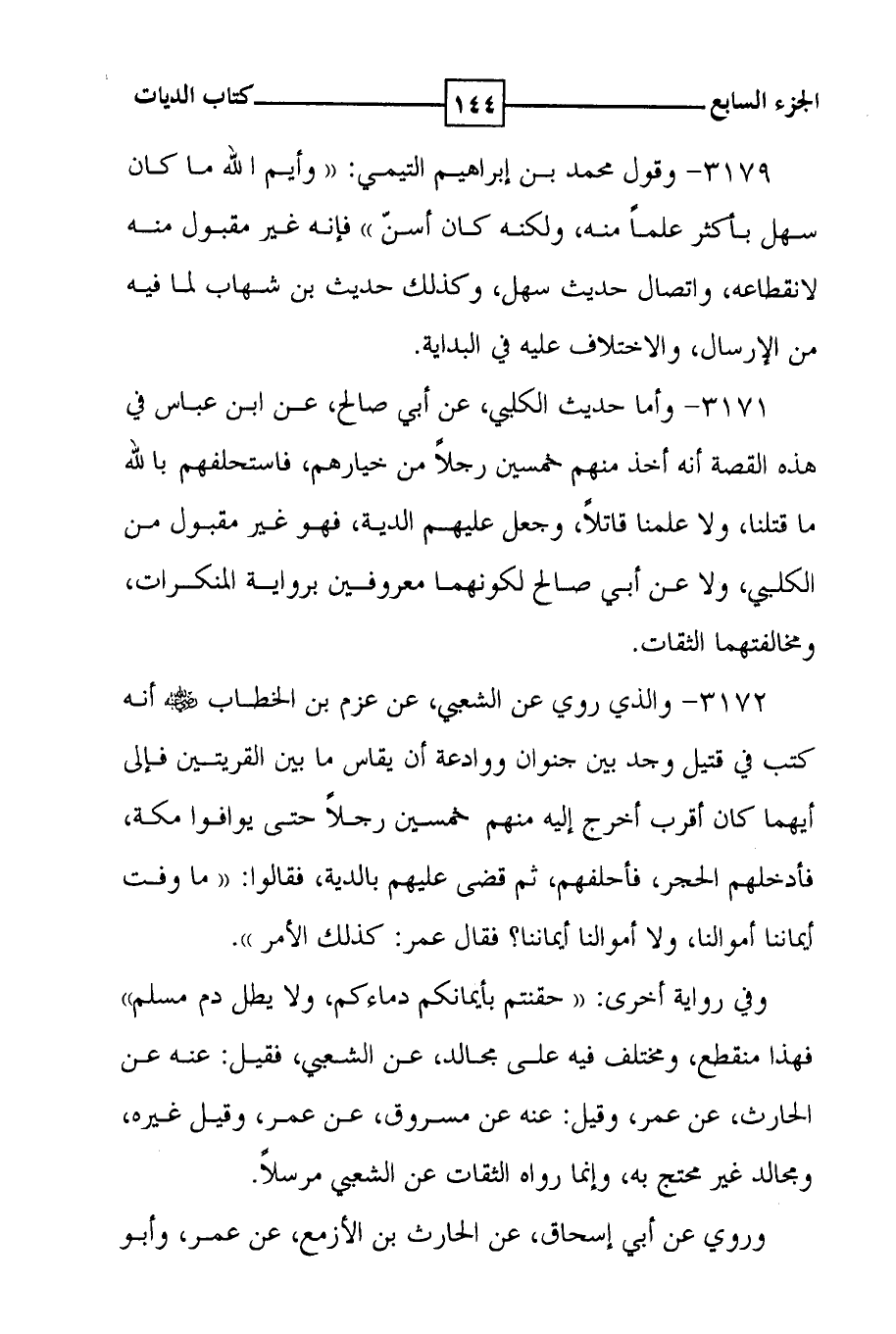 3171 - وأما حديث الكلبي ، عن أبي صالح ، عن ابن عباس في هذه القصة أنه أخذ منهم خمسين رجلاً من خيارهم ، فاستحلفهم ، بالله ما قتلنا ، ولا علمنا قاتلاً ، وجعل عليهم الدية ، فهو غير مقبول من الكلبي ، ولا عن أبي صالح لكونهما معروفين برواية المنكرات ، ومخالفتهما الثقات .