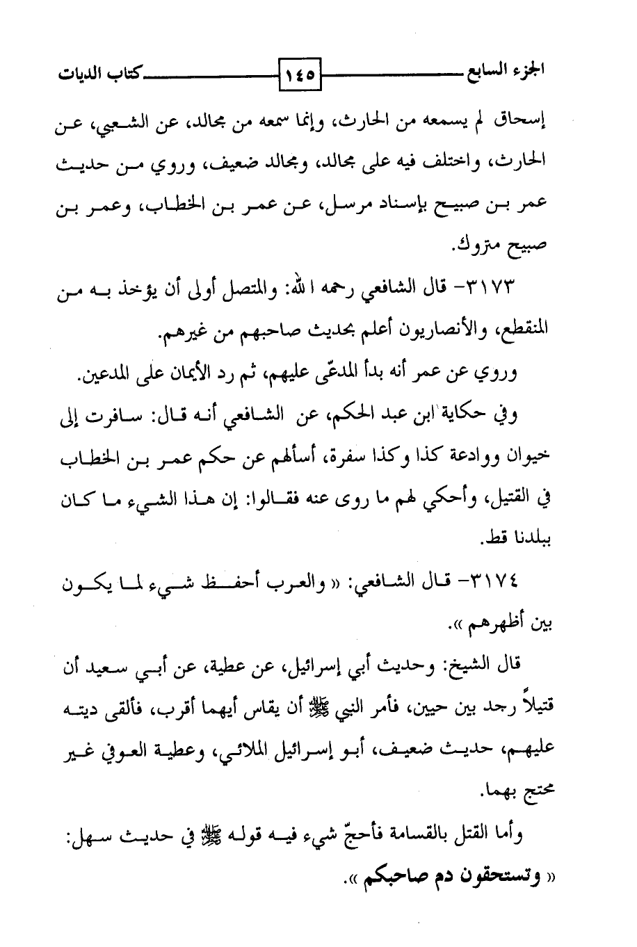 3174 - قال الشافعي : ( ( والعرب أحفظ شيء لما يكون بين أظهرهم ) ) . قال الشيخ : وحديث أبي إسرائيل ، عن عطية ، عن أبي سعيد أن قتيلاً رجد بن حيين ، فأمر النبي صلى الله عليه وسلم أن يقاس أيهما أقرب ، فألقى ديته عليهم ، حديث ضعيف ، أبو إسرائيل الملائي ، وعطية العوفي غير محتج بهما . وأما القتل بالقسامة فأحج شيء فيه قوله صلى الله عليه وسلم في حديث سهل : ( ( وتستحقون دم صاحبكم ) ) .