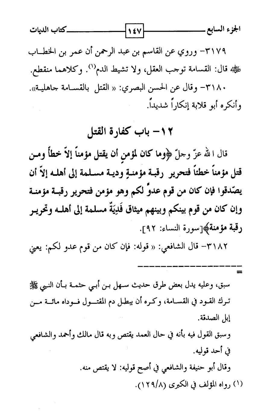 3180 - وقال عن الحسن البصري : ( ( القتل بالقسامة جاهلية ) ) . وأنكره أبو قلابة إنكاراً شديداً . 12 - باب كفارة القتل قال الله عز وجل ( وما كان لمؤمن أن يقتل مؤمناً إلا خطأ ومن قتل مؤمناً خطئاً فتحرير رقبة مؤمنة ودية مسلمة إلى أهله إلا أن يصدقوا فإن كان من قوم عدو لكم وهو مؤمن فتحرير رقبة مؤمنة وإن كان من قوم بينكم وبينهم ميثاق فدية مسلمة إلى أهله وتحرير رقبة مؤمنة ) [ سورة النساء : 92 ] .