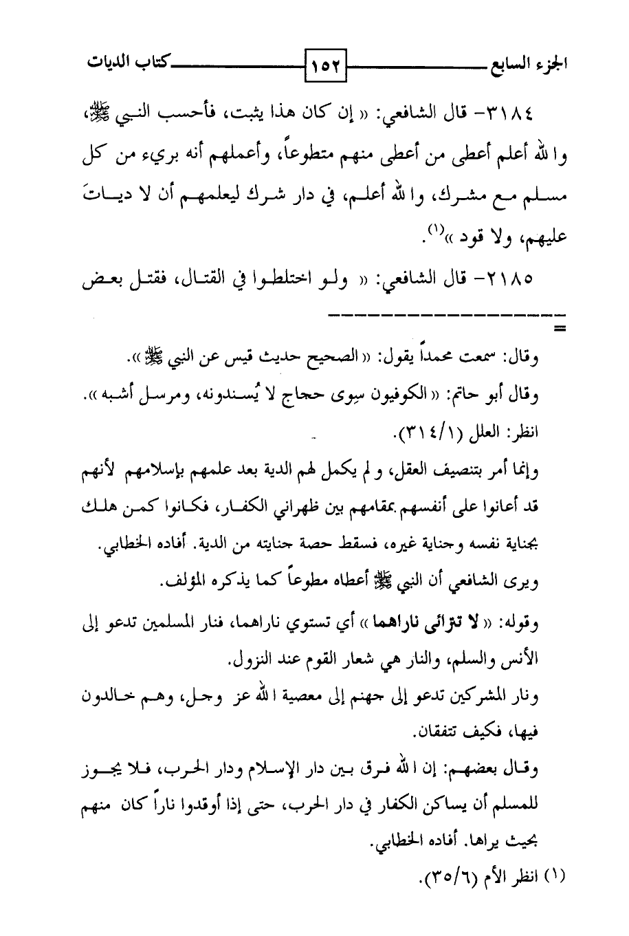 3184 - قال الشافعي : إن كان هذا يثبت ، فأحسب النبي صلى الله عليه وسلم ، والله أعلم أعطى من أعطى منهم متطوعاً ، وأعملهم أنه بريء من كل مسلم مع مشرك ، والله أعلم ، في دار شرك ليعلمهم أن لا ديات عليهم ، ولا قود ) ) ( 1 ) .