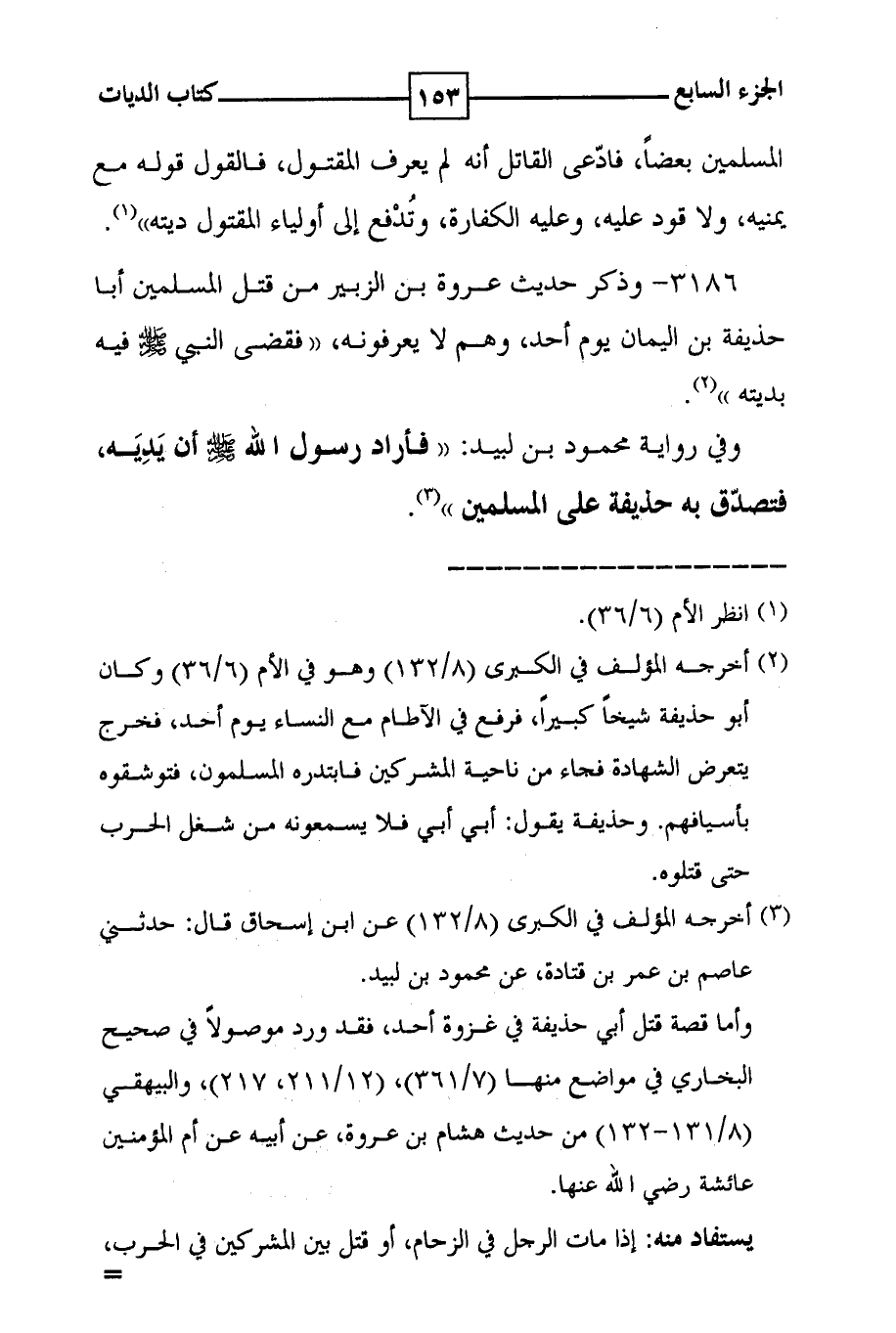 3186 - وذكر حديث عروة بن الزبير من قتل المسلمين أبا حذيفة بن اليمان يوم أحد ، وهم لا يعرفونه ، ( ( فقضى النبي صلى الله عليه وسلم فيه بديته ) ) ( 2 ) . وفي رواية محمود بن لبيد : ( ( فأراد رسول الله صلى الله عليه وسلم أن يديه ، فتصدق به حذيفة على المسلمين ) ) ( 3 ) .