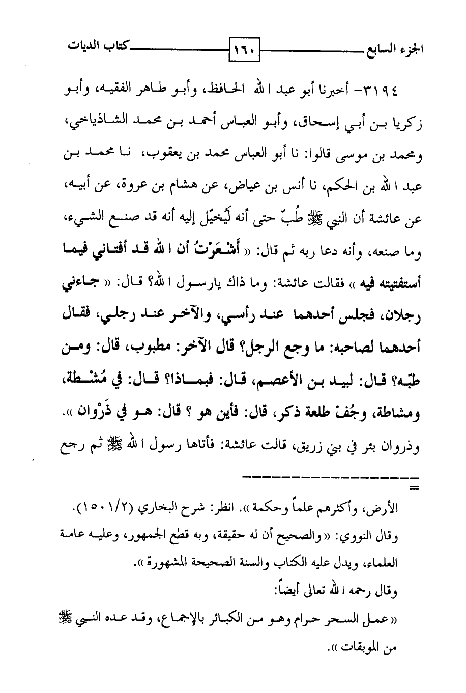 3194 - أخبرنا أبو عبد الله الحافظ ، وأبو طاهر الفقيه ، وأبو زكريا بن أبي إسحاق ، وأبو العباس أحمد بن محمد الشاذياخي ، ومحمد بن موسى قالوا : نا أبو العباس محمد بن يعقوب ، نا محمد بن عبد الله بن الحكم ، نا أنس بن عياض ، عن هشام بن عروة ، عن أبيه ، عن عائشة أن النبي صلى الله عليه وسلم طب حتى أنه ليخيل إليه أنه قد صنع الشيء ، وما صنعه ، وأنه دعا ربه ثم قال : ( ( أشعرت أن الله قد أفتاني فيما أستفتيته فيه ) ) فقالت عائشة : وما ذاك يا رسول الله ؟ قال : ( ( جاءني رجلان ، فجلس أحدهما عند رأسي ، والآخر عند رجلي ، فقال أحدهما لصاحبه : ما وجع الرجل ؟ قال الآخر : مطبوب ، قال : ومن طبة ؟ قال : لبيد بن الأعصم ، قال : فبمادا ؟ قال : في مشطة ، ومشاطة ، وجف طلعة ذكر ، قال : فأين هو ؟ قال : هو في ذروان ) ) . وذروان بئر في بني زريق ، قالت عائشة : فأتاها رسول الله ثم رجع