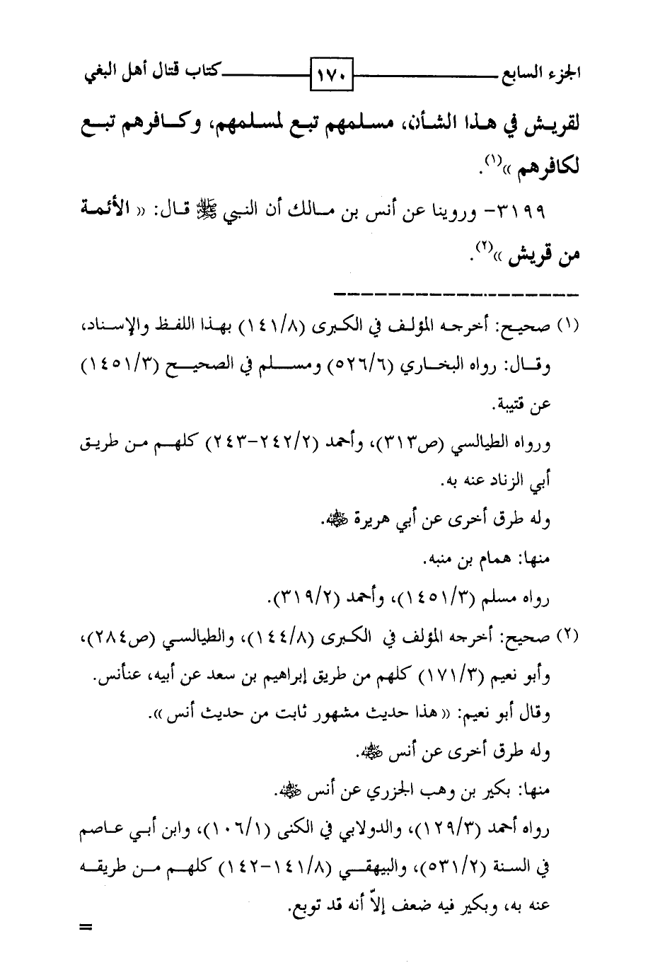 3199 - وروينا عن أنس بن مالك أن النبي صلى الله عليه وسلم قال : ( ( الأئمة من قريش ) ) ( 2 ) .