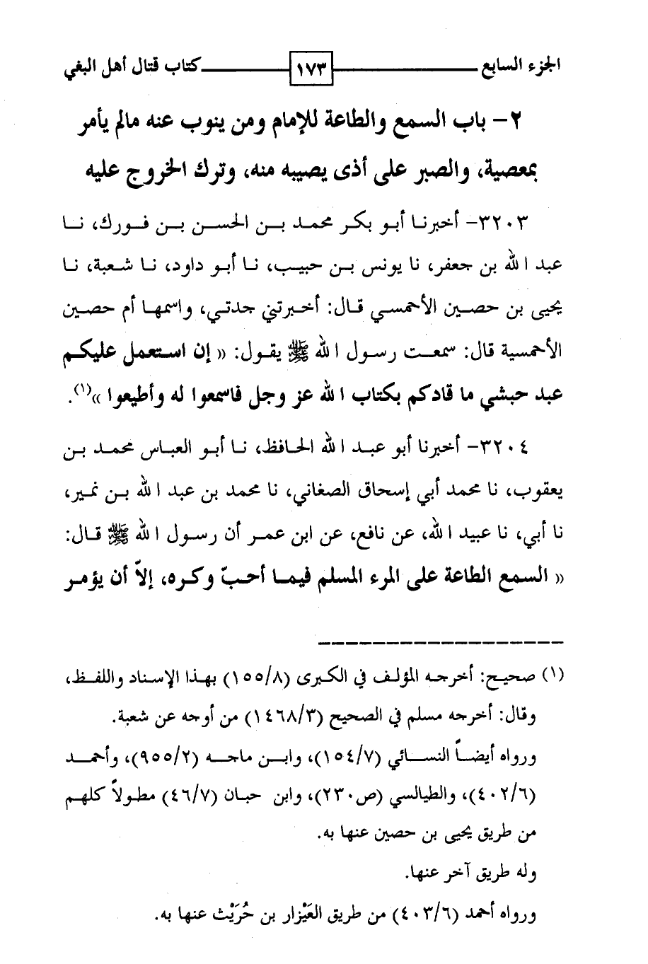 3204 - أخبرنا أبو عبد الله الحافظ ، نا أبو العباس محمد بن يعقوب ، نا محمد أبي إسحاق الصغاني ، نا محمد بن عبد الله بن نمير ، نا أبي ، نا عبيد الله ، عن نافع ، عن ابن عمر أن رسول الله صلى الله عليه وسلم قال : ( ( السمع الطاعة على المرء المسلم فيما أحب وكره ، إلا أن يؤمر