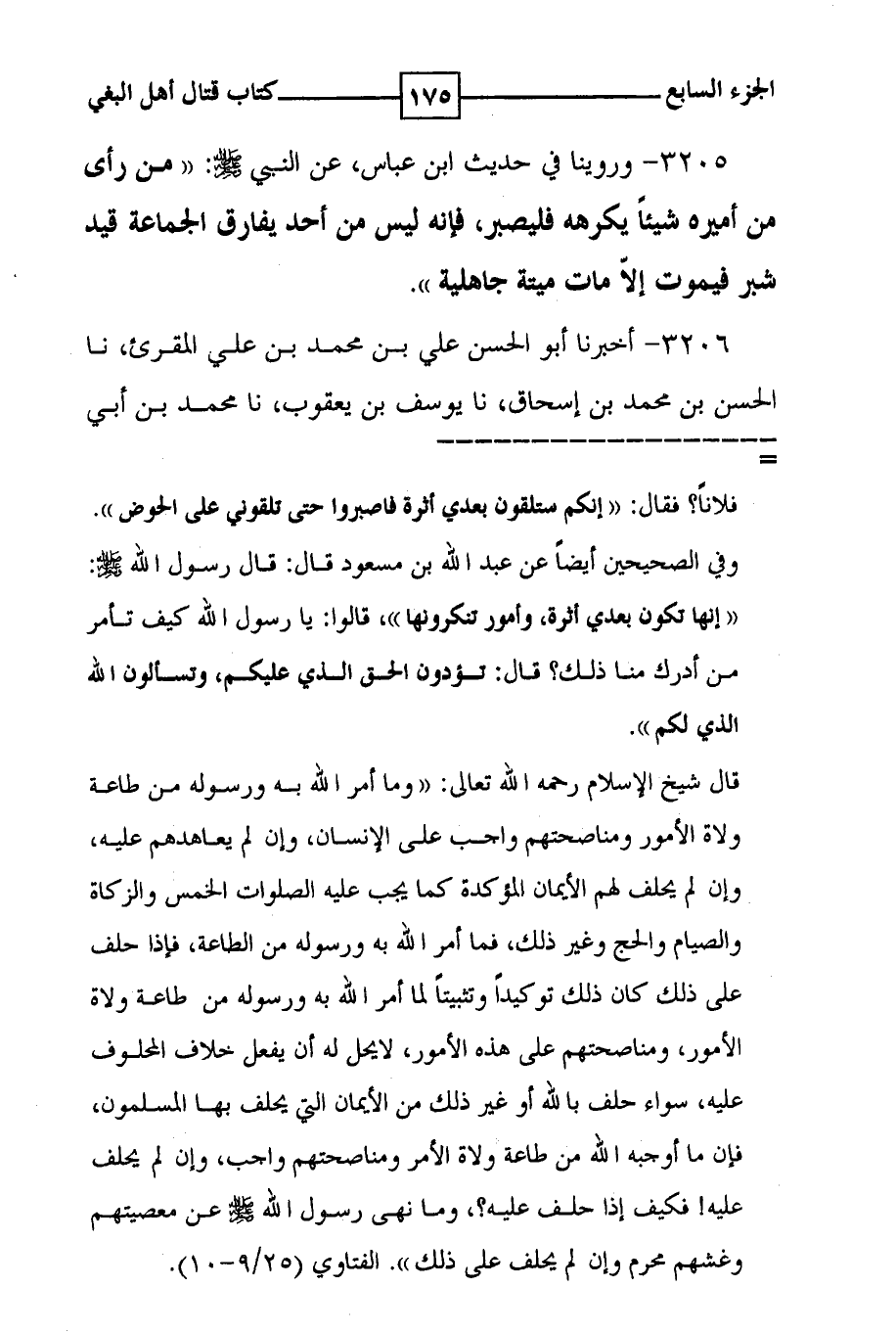 3250 - وروينا في حديث ابن عباس ، عن النبي صلى الله عليه وسلم : ( ( من رأى من أميره شيئاً يكرهه فليصبر ، فإنه ليس من أحد يفارق الجماعة قيد شبر فيموت إلا مات ميتة جاهلية ) ) .