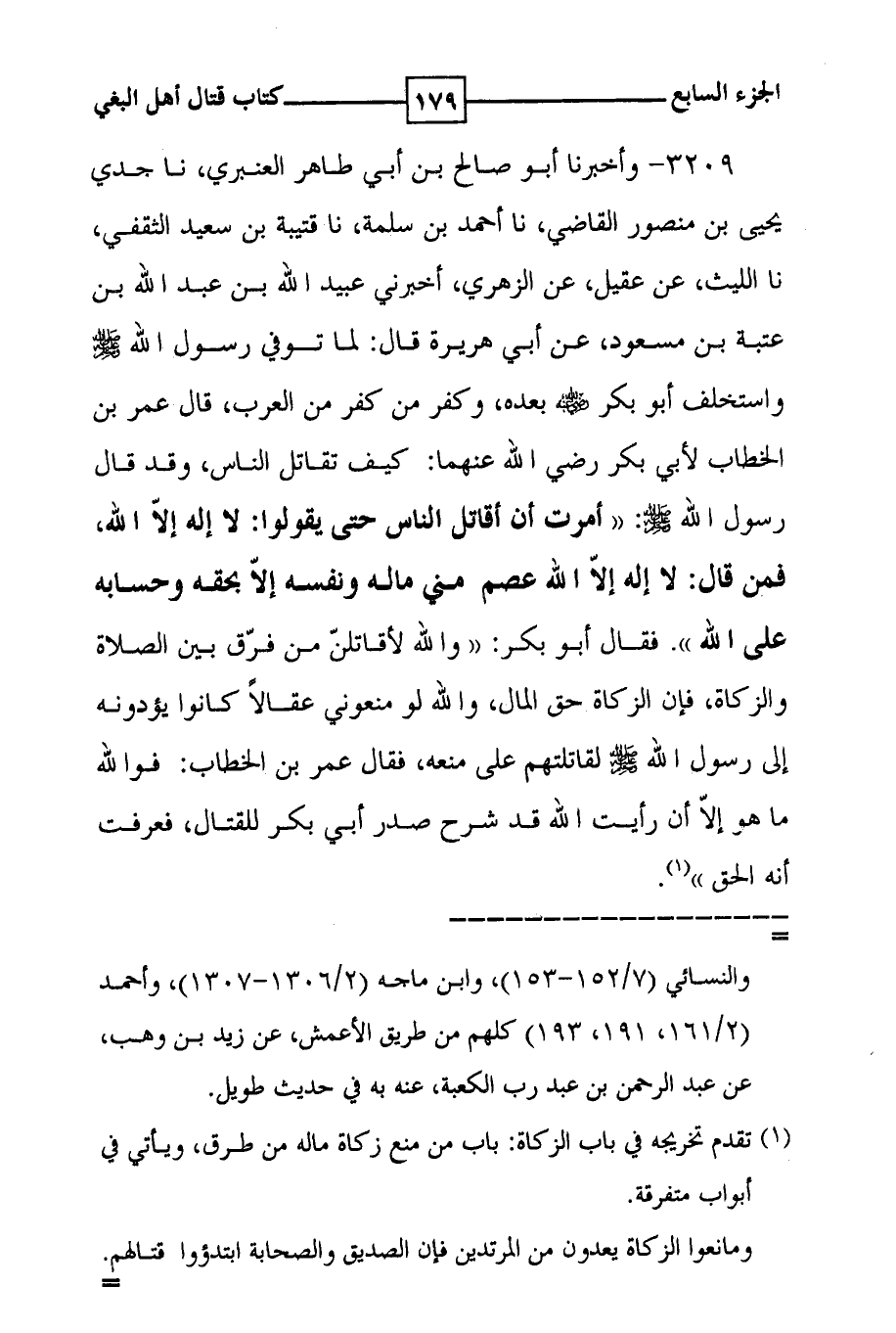 3029 - وأخبرنا أبو صالح بن أبي طاهر العنبري ، نا جدي يحيى بن منصور القاضي ، نا أحمد بن سلمة ، نا قتيبة بن سعيد الثقفي ، نا الليث ، عن عقيل ، عن الزهري ، أخبرني عبيد الله بن عبد الله بن عتبة بن مسعود ، عن أبي هريرة قال : لما توفي رسول الله صلى الله عليه وسلم واستخلف أبو بكر صلى الله عليه وسلم بعده ، وكفر من كفر من العرب ، قال عمر بن الخطاب لأبي بكر رضي الله عنهما : كيف تقاتل الناس ، وقد قال رسول الله صلى الله عليه وسلم : ( ( أمرت أن أقاتل الناس حتى يقولوا : لا إله إلا الله ، فمن قال : لا إله إلا الله عصم مني ماله ونفسه إلا بحقه وحسابه على الله ) ) . فقال أبو بكر : ( ( والله لأقاتلن من فرق بين الصلاة والزكاة ، فإن الزكاة حق المال ، والله لو منعوني عقالاً كانوا يؤدونه إلى رسول الله صلى الله عليه وسلم لقاتلتهم على منعه ، فقال عمر بن الخطاب : فو الله ما هو إلا أن رأيت الله قد شرح صدر أبي بكر للقتال ، فعرفت أنه الحق ) ) ( 1 ) .