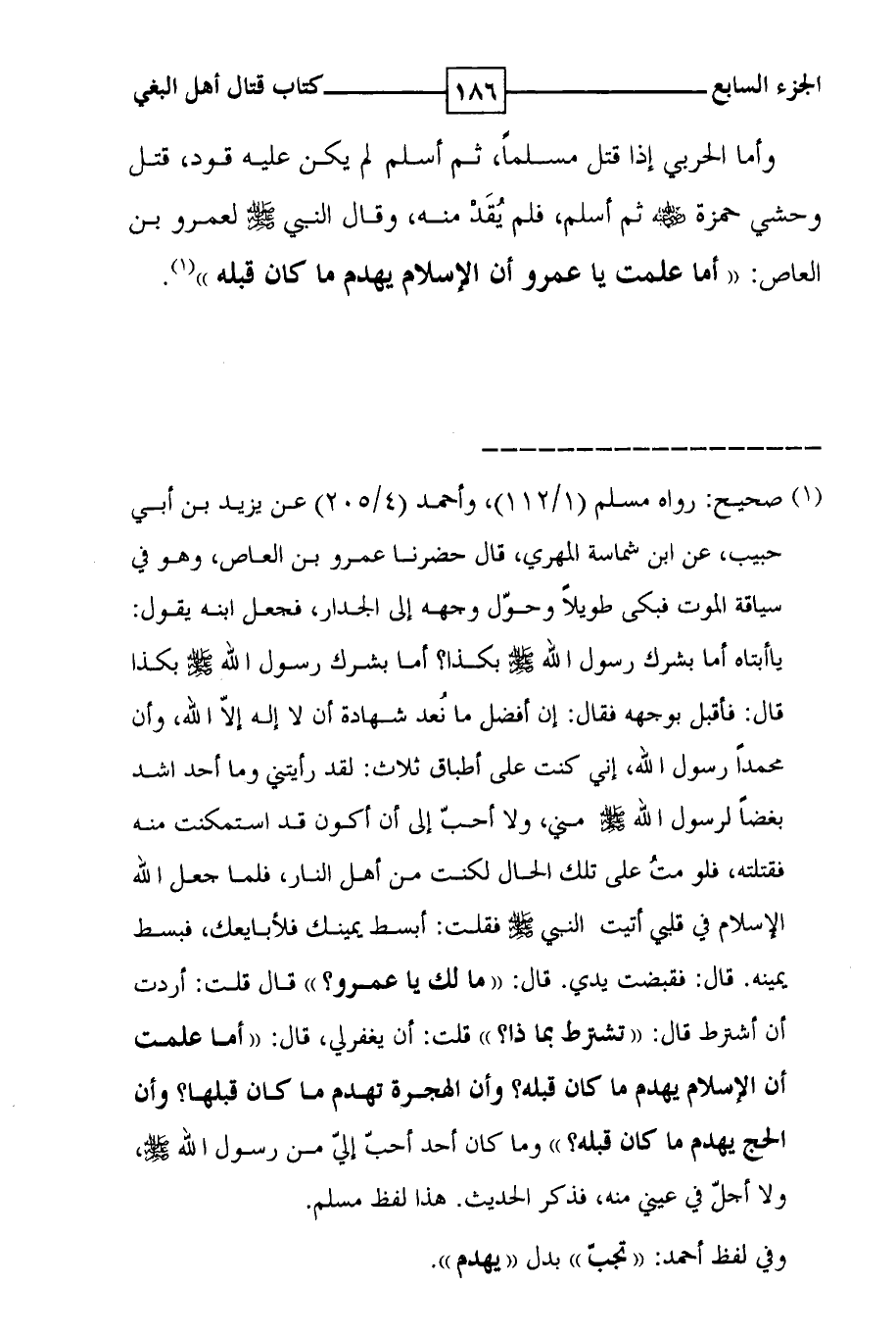 وأما الحربي إذا قتل مسلماً ، ثم أسلم لم يكن عليه قود ، قتل وحشي حمزة صلى الله عليه وسلم ثم أسلم ، فلم يقد منه ، وقال النبي صلى الله عليه وسلم لعمرو بن العاص : ( ( أما علمت يا عمرو أن الإسلام يهدم ما كان قبله ) ) ( 1 ) .