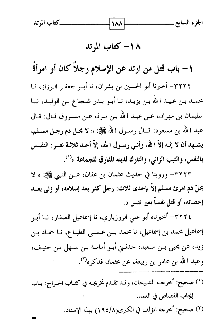 3222 - أخبرنا أبو الحسين بن بشران ، نا أبو جعفر الرزاز ، نا محمد بن عبيد الله بن يزيد ، نا أبو بدر شجاع بن الوليد ، نا سليمان بن مهران ، عن عبد الله بن مرة ، عن مسروق قال : قال عبد الله بن مسعود : قال رسول الله صلى الله عليه وسلم : ( ( لا يحل دم رجل مسلم ، يشهد أن لا إله إلا الله ، وأني رسول الله ، إلا أحد ثلاثة نفر : النفس بالنفس ، والثيب الزاني ، والتارك لدينه المفارق للجماعة ) ) ( 1 ) .