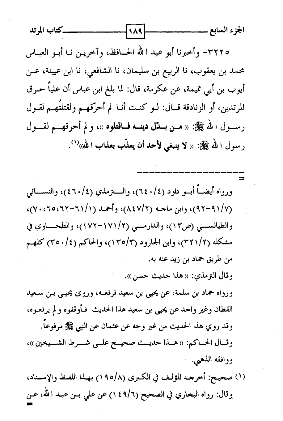 3225 - وأخبرنا أبو عبد الله الحافظ ، وآخرين نا أبو العباس محمد ين يعقوب ، نا الربيع بن سليمان ، نا الشافعي ، نا ابن عيينة ، عن أيوب بن أبي تميمة ، عن عكرمة ، قال : لما بلغ ابن عباس أن علياً حرق المرتدين ، أو الزنادقة قال : لو كنت أنا لم أحرقهم ولقتلهم لقول رسول الله صلى الله عليه وسلم : ( ( من بدل دينه فاقتلوه ) ) ، ولم أحرقهم لقول رسول الله صلى الله عليه وسلم : ( ( لا ينبغي لأحد أن يعذب بعذاب الله ) ) ( 1 ) .
