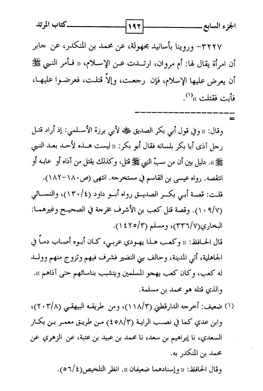 3227 - وروينا بأسانيد مجهولة ، عن محمد بن المنكدر ، عن جابر أن امرأة يقال لها : أم مروان ، ارتدت عن الإسلام ، ( ( فأمر النبي صلى الله عليه وسلم أن يعرض عليها الإسلام ، فإن رجعت ، وإلا قتلت ، فعرضوا عليها ، فأبت فقتلت ) ) ( 1 ) .