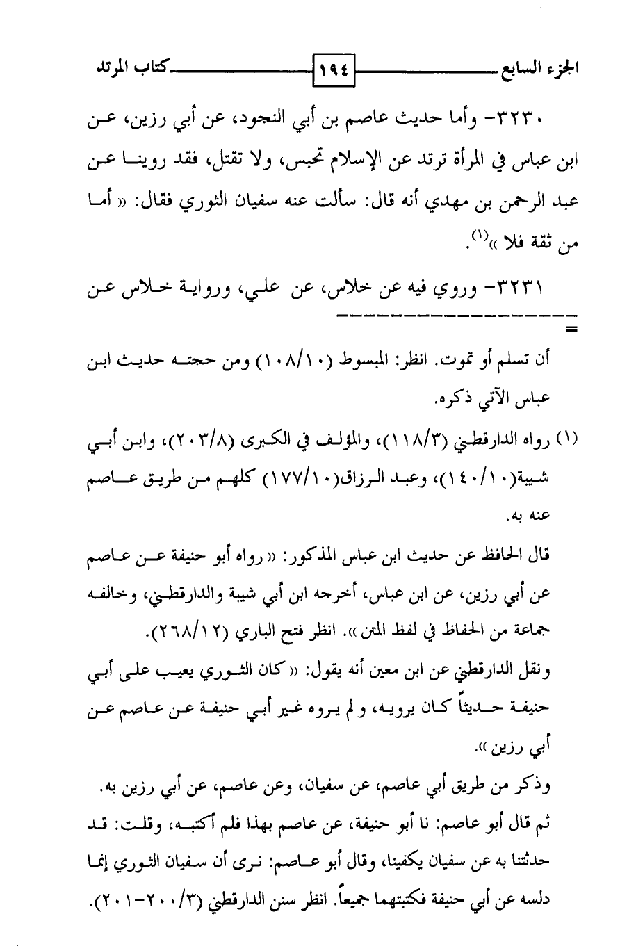 3230 - وأما حديث عاصم بن أبي النجود ، عن أبي رزين ، عن ابن عباس في المرأة ترتد عن الإسلام تحبس ، ولا تقتل ، فقد روينا عن عبد الرحمن بن مهدي أنه قال : سألت عنه سفيان الثوري فقال : : ( ( أما من ثقة فلا ) ) ( 1 ) .