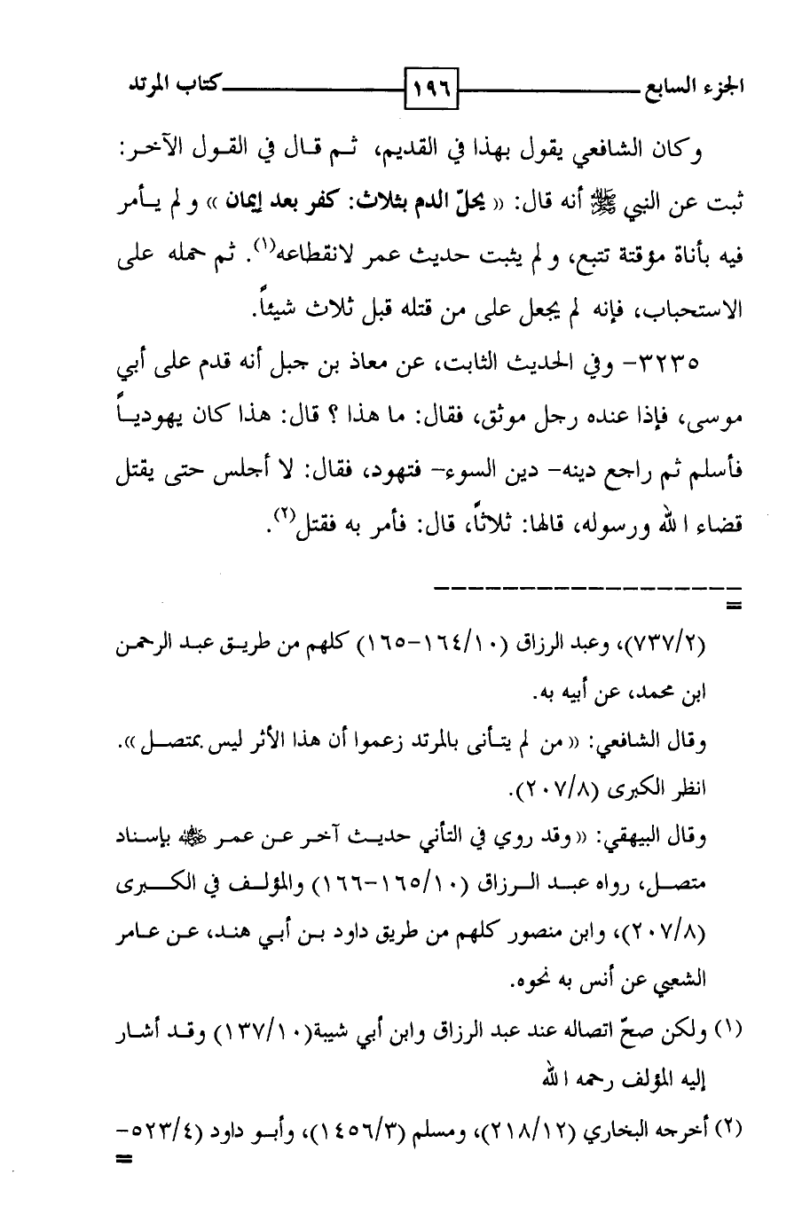 3235 - وفي الحديث الثابت ، عن معاذ بن جبل أنه قدم على أبي موسى ، فإذا عنده رجل موثق ، فقال : ما هذا ؟ قال : هذا كان يهودياً فأسلم ثم راجع دينه - دين السوء - فتهود ، فقال : لا أجلس حتى يقتل قضاء الله ورسوله ، قالها : ثلاثاً ، قال : فأمر به فقتل ( 2 ) .