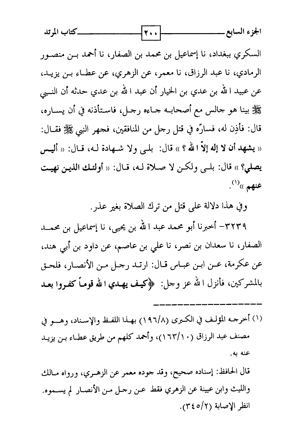 السكري ببغداد ، نا إسماعيل بن محمد بن الصفار ، نا أحمد بن منصور الرمادي ، نا عبد الرزاق ، نا معمر ، عن الزهري ، عن عطاء بن يزيد ، عن عبيد الله بن عدي بن الخيار أن عبد الله بن عدي حدثه أن النبي صلى الله عليه وسلم بينا هو جالس مع أصحابه جاءه رجل ، فاستأذنه في أن يساره ، قال : فأذن له ، فساره في قتل رجل من المنافقين ، فجهر النبي صلى الله عليه وسلم فقال : ( ( يشهد أن لا إله إلا الله ؟ قال : بلى ولا شهادة له ، قال : ( ( أليس يصلي ؟ ) ) قال : بلى ولكن لا صلاة له ، قال : ( ( أولئك الذين نهيت عنهم ) ) ( 1 ) . وفي هذا دلالة على قتل من ترك الصلاة بغير عذر .