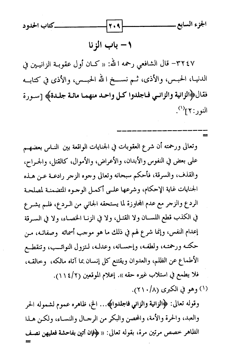 3247 - قال الشافعي رحمه الله : ( ( كان أول عقوبة الزانيين في الدنيا ، الحبس ، والأذى ، ثم نسخ الله الحبس ، والأذى في كتابه فقال ! ( الزانية والزاني فاجلدوا كل واحد منهما مائة جلدة ) ! [ سورة النور : 2 ] ( 1 ) .