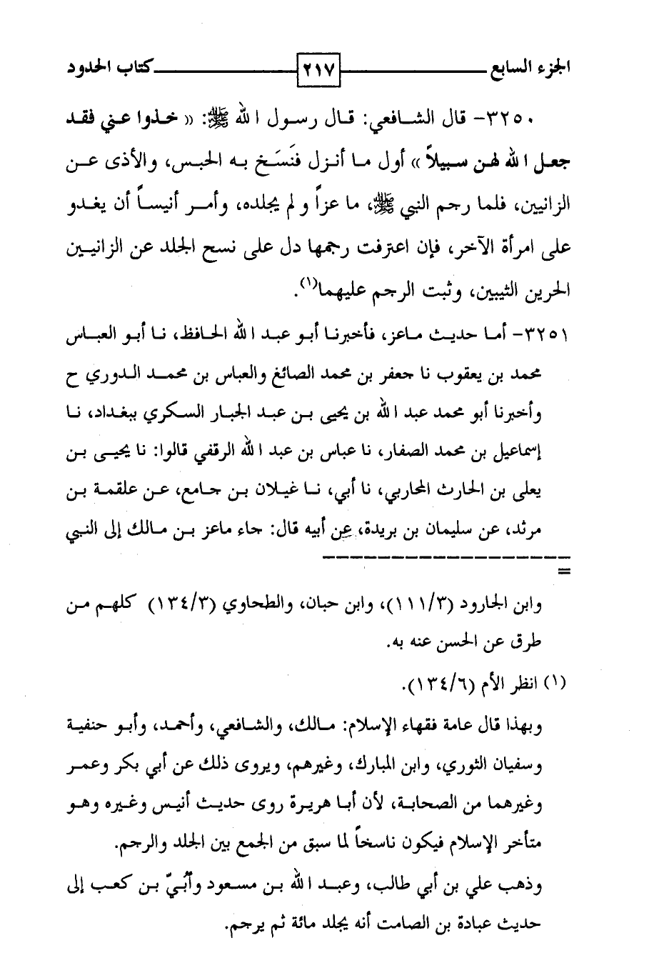 3250 - قال الشافعي : قال رسول الله صلى الله عليه وسلم : ( ( خذوا عني فقد جعل الله لهن سبيلاً ) ) أول ما أنزل فنسخ به الحبس ، والأذى عن الزانيين ، فلما رجم النبي صلى الله عليه وسلم ، ما عزاً ولم يجلده ، وأمر أنيساً أن يغدو على امرأة الآخر ، فإن اعترفت رجمها دل على نسخ الجلد عن الزانيين الحرين الثيبين ، وثبت الرجم عليهما ( 1 ) .