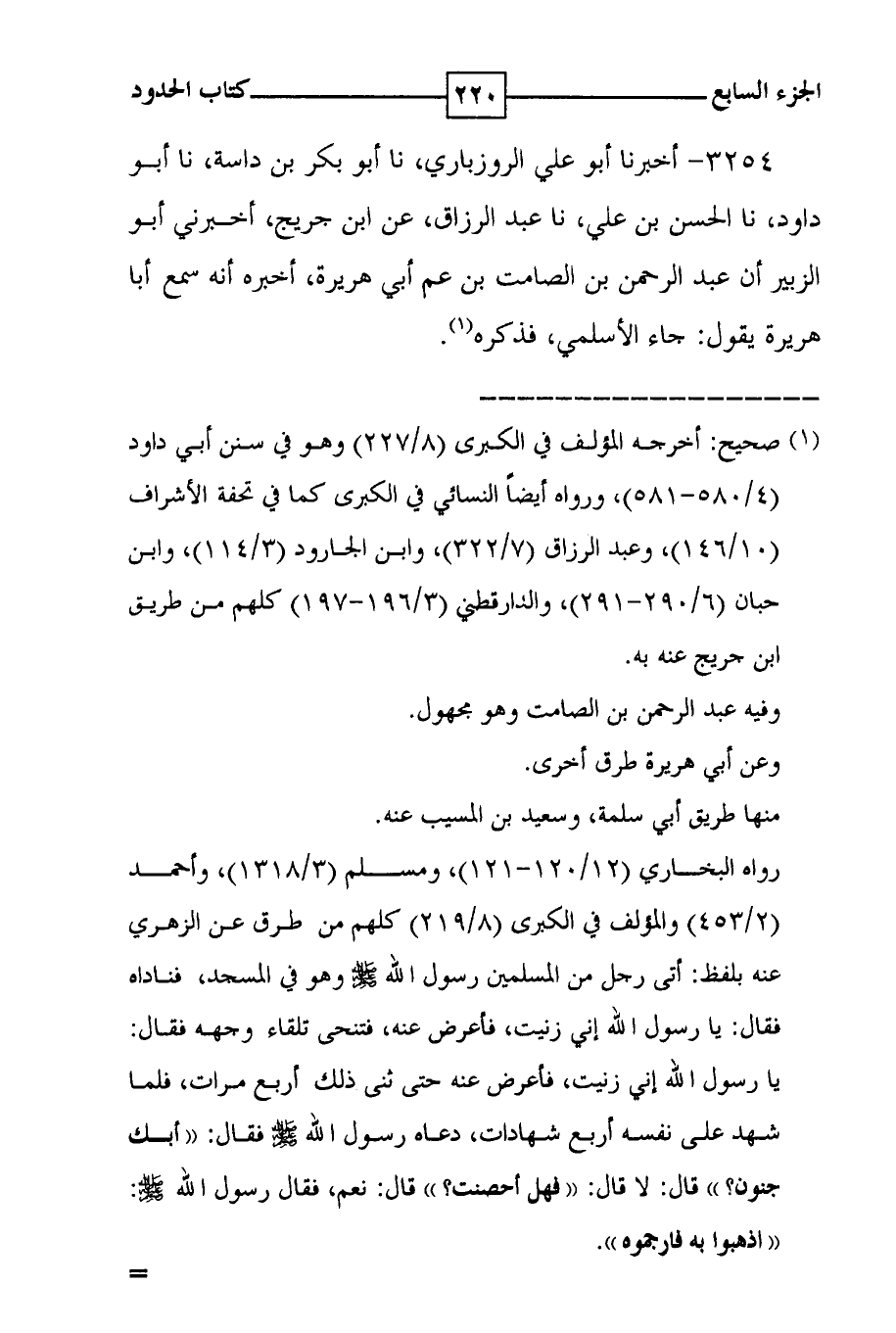 3245 - أخبرنا أبو علي الروزباري ، نا أبو بكر بن داسة ، نا أبو داود ، نا الحسن بن علي ، نا عبد الرزاق ، عن ابن جريج ، أخبرني أبو الزبير أن عبد الرحمن بن الصامت بن عم أبي هريرة ، أخبره أنه سمع أبا هريرة يقول : جاء الأسلمي ، فذكره ( 1 ) .