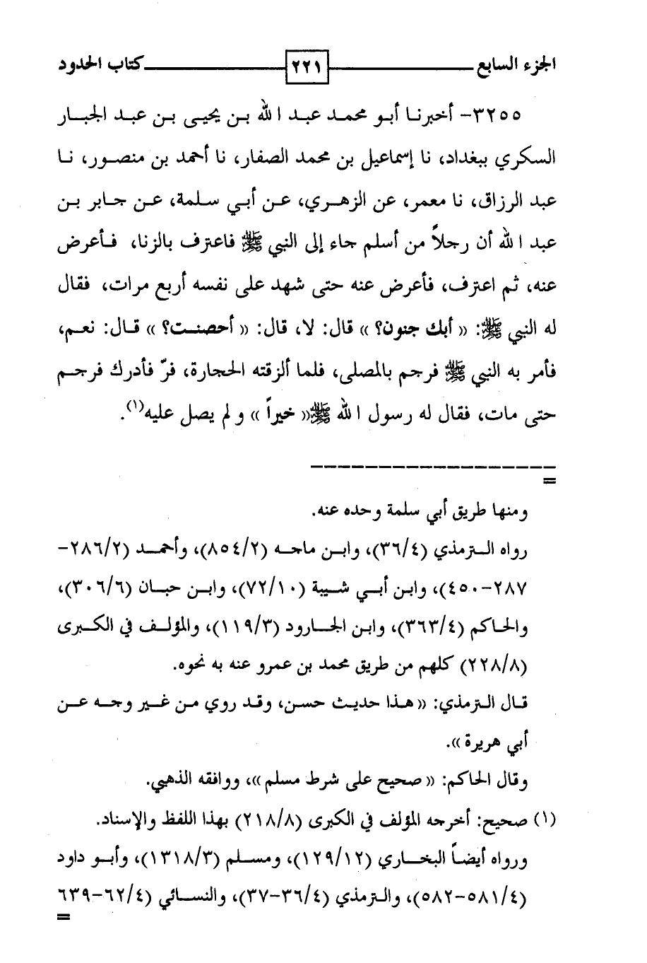 3255 - أخبرنا أبو محمد عبد الله بن يحيى بن عبد الجبار السكري ببغداد ، نا إسماعيل بن محمد الصفار ، نا أحمد بن منصور ، نا عبد الرزاق ، نا معمر ، عن الزهري ، عن أبي سلمة ، عن جابر بن عبد الله أن رجلاً من أسلم جاء إلى النبي صلى الله عليه وسلم فاعترف بالزنا ، فأعرض عنه ، ثم اعترف ، فأعرض عنه حتى شهد على نفسه أربع مرات ، فقال له النبي صلى الله عليه وسلم : ( ( أبك جنون ؟ ) ) قال : لا ، قال : ( أحصنت ؟ ) ) قال : نعم ، فأمر به النبي صلى الله عليه وسلم فرجم بالمصلى ، فلما ألزقته الحجارة ، فر فأدرك فرجم حتى مات ، فقال له رسول الله صلى الله عليه وسلم ( ( خيراً ) ) ولم يصل عليه ( 1 ) .