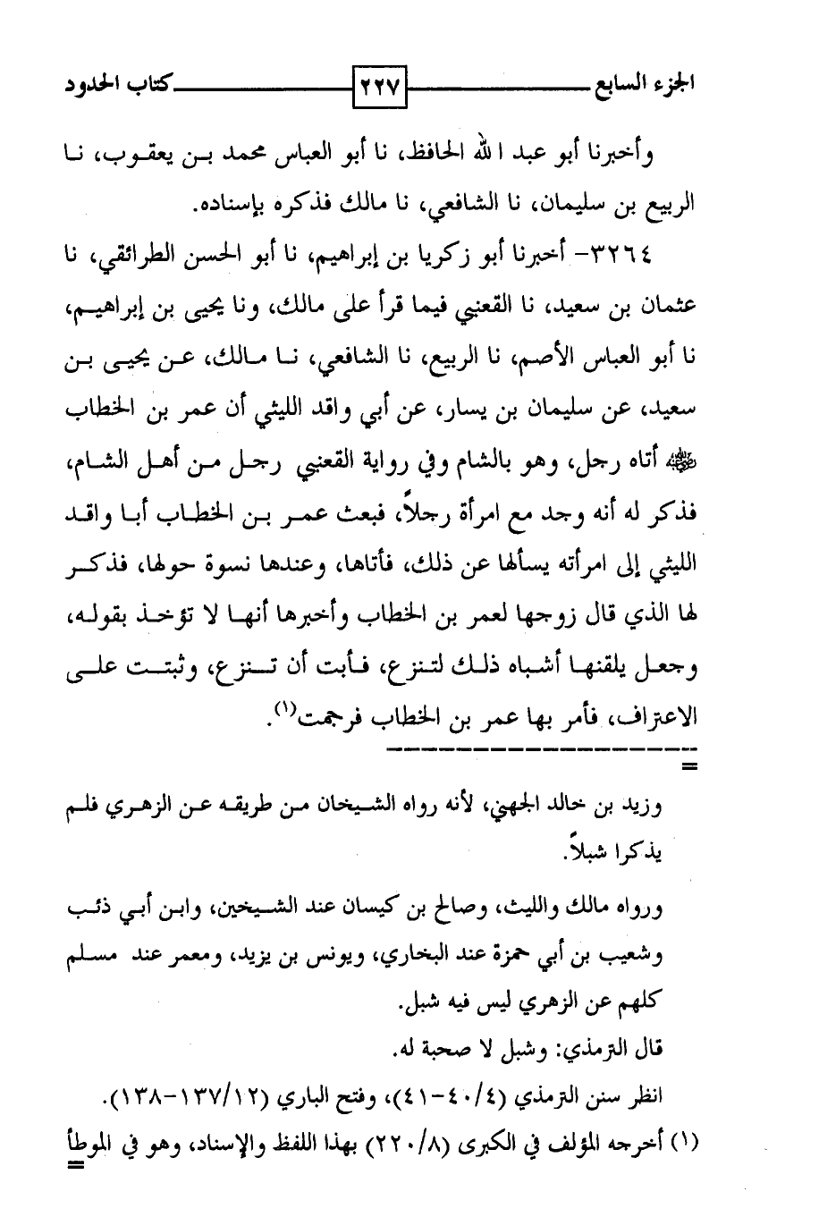 3264 - أخبرنا أبو زكريا بن إبراهيم ، نا أبو الحسن الطرائفي ، نا عثمان بن سعيد ، نا القعنبي فيما قرأ على مالك ، ونا يحيى بن إبراهيم ، نا أبو العباس الأصم ، نا الربيع ، نا الشافعي ، نا مالك ، عن يحيى بن سعيد ، عن سليمان بن يسار ، عن أبي واقد الليثي أن عمر بن الخطاب صلى الله عليه وسلم أتاه رجل ، وهو بالشام وفي رواية القعنبي رجل من أهل الشام ، فذكر له أنه وجد مع امرأة رجلاً ، فبعث عمر بن الخطاب أبا واقد الليثي إلى امرأته يسألها عن ذلك ، فأتاها ، وعندها نسوة حولها ، فذكر لها الذي قال زوجها لعمر بن الخطاب وأخبرها أنها لا تؤخذ بقوله ، وجعل يلقنها إشباه ذلك لتنزع ، فأبت أن تنزع ، وثبتت على الاعتراف ، فأمر بها عمر بن الخطاب فرجمت ( 1 ) .