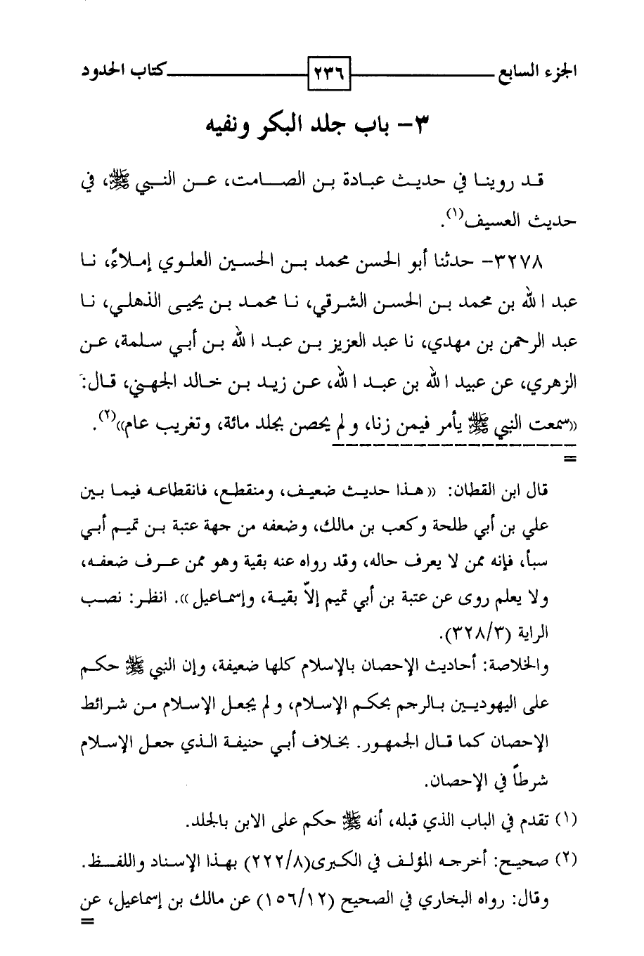 3278 - حدثنا أبو الحسن محمد بن الحسين العلوي إملاء ، نا عبد الله بن محمد بن الحسن الشرقي ، نا محمد ين يحيى الذهلي ، نا عبد الرحمن بن مهدي ، نا عبد العزيز بن عبد الله بن أبي سلمة ، عن الزهري ، عن عبيد الله بن عبد الله ، عن زيد بن خالد الجهني ، قال : ( ( سمعت النبي صلى الله عليه وسلم يأمر فيمن زنا ، ولم يحصن بجلد مائة ، وتغريب عام ) ) ( 2 ) .