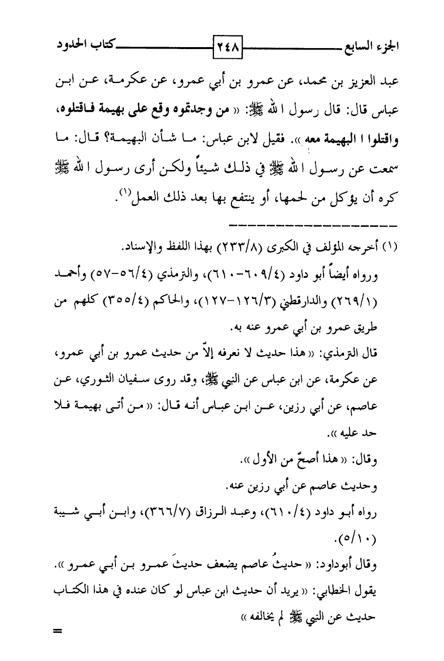 عبد العزيز بن محمد ، عن عمرو بن أبي عمرو ، عن عكرمة ، عن ابن عباس قال : قال رسول الله صلى الله عليه وسلم : ( ( من وجدتموه وقع على بهيمة فاقتلوه ، واقتلوا البهيمة معه ) ) . فقيل لابن عباس : ما شأن البهيمة ؟ قال : ما سمعت عن رسول الله صلى الله عليه وسلم في ذلك شيئاً ولكن أرى رسول الله صلى الله عليه وسلم كره أن يؤكل من لحمها ، أو ينتفع بها بعد ذلك العمل ( 1 ) .