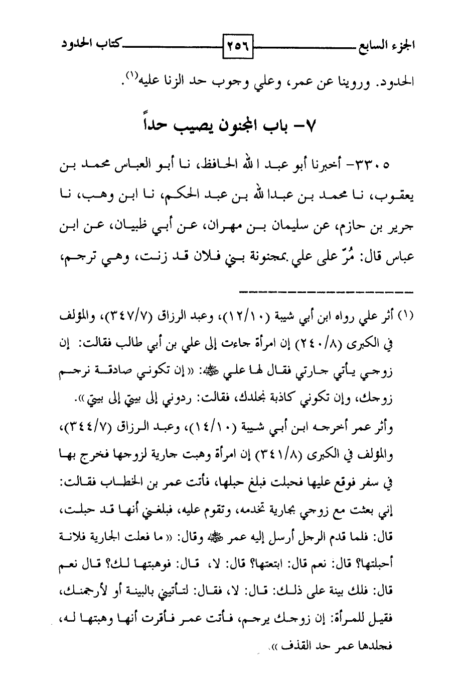 الحدود . وروينا عن عمر ، وعلي وجوب حد الزنا عليه ( 1 ) . 7 - باب المجنون يصيب حداً