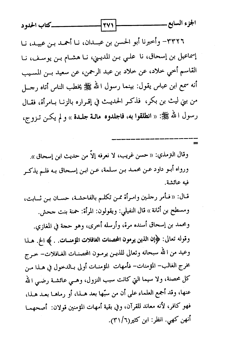 3326 - وأخبرنا أبو الحسن بن عبدان ، نا أحمد بن عبيد ، نا إسماعيل بن إسحاق ، نا علي بن المديني ، نا هشام بن يوسف ، نا القاسم أخي خلاد ، عن خلاد بن عبد الرحمن ، عن سعيد بن المسيب أنه سمع ابن عباس يقول : بينما رسول الله صلى الله عليه وسلم يخطب الناس أتاه رجل من بني ليث بن بكر ، فذكر الحديث في إقراره بالزنا بامرأة ، فقال رسول الله صلى الله عليه وسلم : ( ( انطلقوا به ، فاجلدوه مائة جلدة ) ) ولم يكن تزوج ،