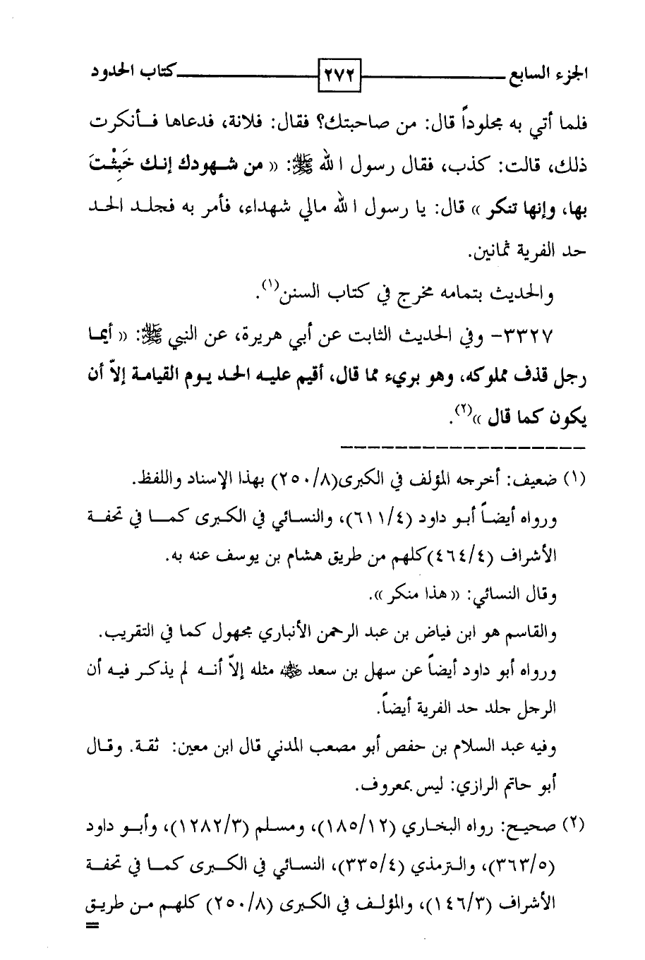 3327 - وفي الحديث الثابت عن أبي هريرة ، عن النبي صلى الله عليه وسلم : ( ( أيما رجل قذف مملوكه ، وهو بريء مما قال ، أقيم عليه الحد يوم القيامة إلا أن يكون كما قال ) ) ( 2 ) .