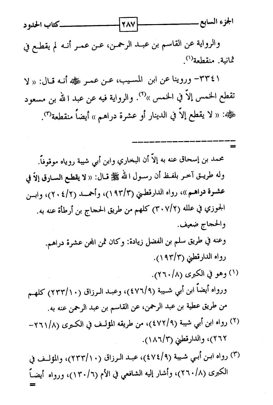 3341 - وروينا عن ابن المسيب ، عن عمر صلى الله عليه وسلم أنه قال : ( ( لا تقطع الخمس إلا في الخمس ) ) ( 2 ) . والرواية فيه عن عبد الله بن مسعود صلى الله عليه وسلم : ( ( لا يقطع إلا في الدينار أو عشرة دراهم ) ) أيضاً منقطعة ( 3 ) .
