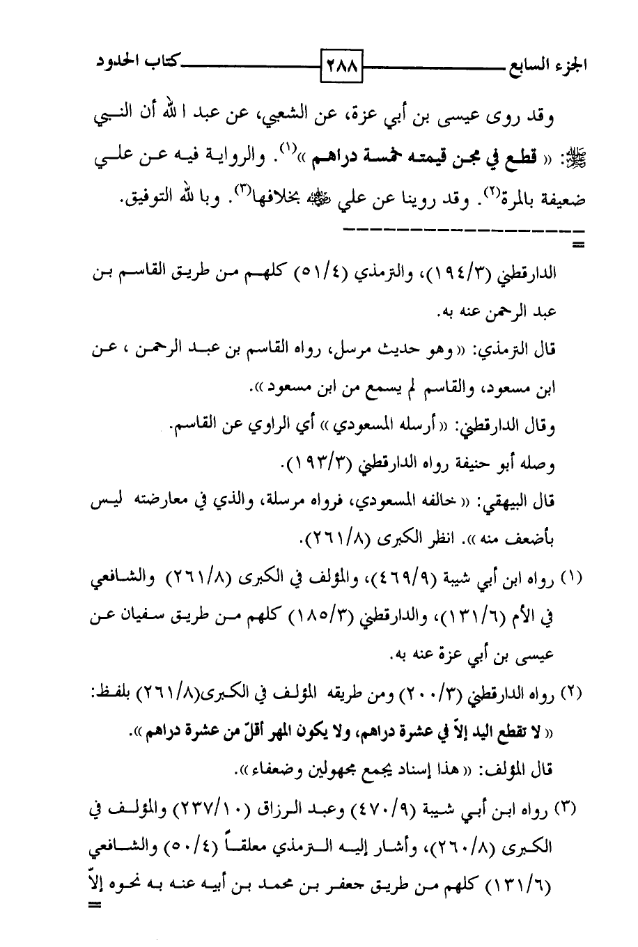 وقد روى عيسى بن أبي عزة ، عن الشعبي ، عن عبد الله أن النبي صلى الله عليه وسلم : ( ( قطع في مجن قيمته خمسة دراهم ) ) ( 1 ) . والرواية فيه عن علي ضعيفة بالمرة ( 2 ) . وقد روينا عن علي رضي الله عنه بخلافها ( 3 ) . وبالله التوفيق . ت