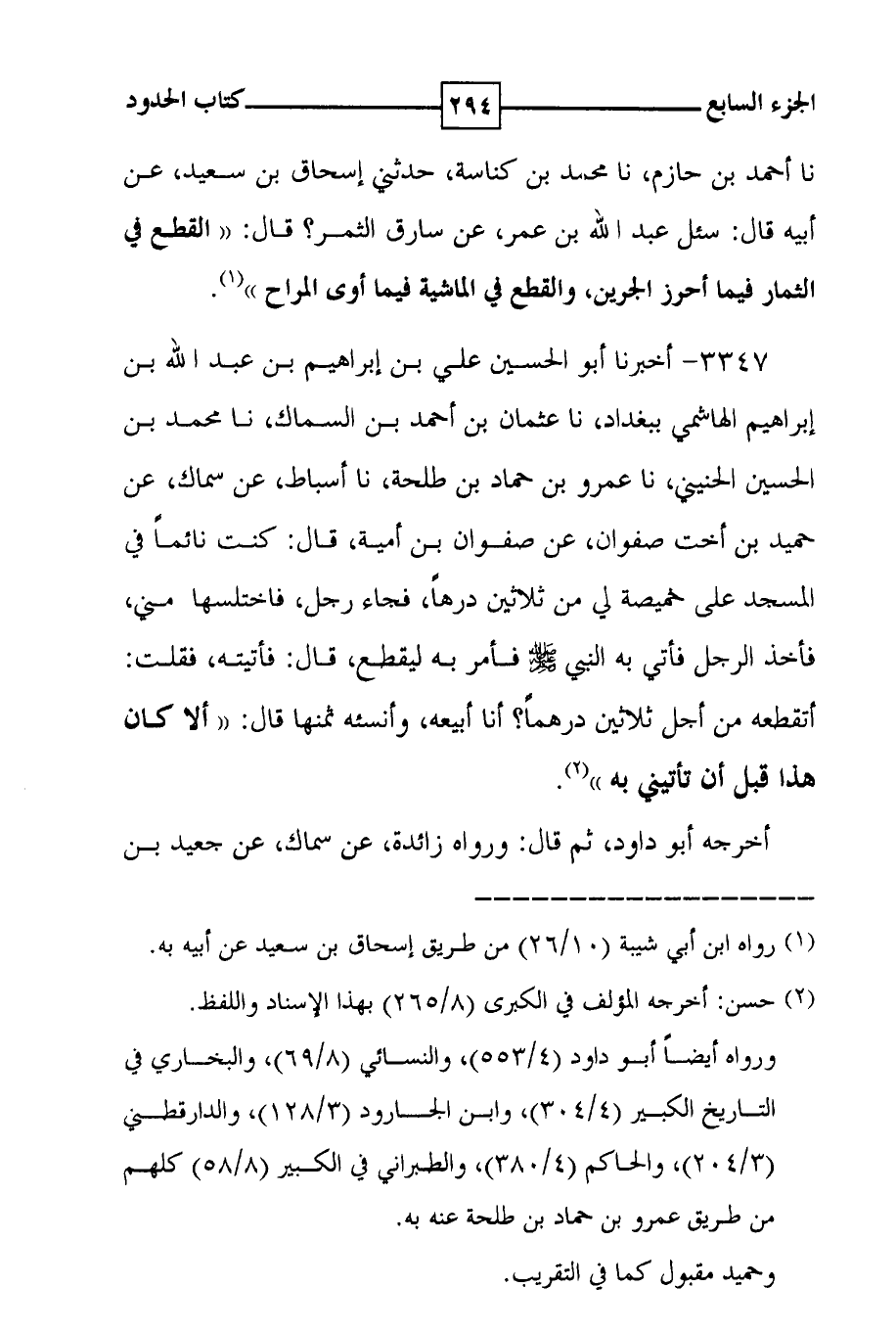 3347 - أخبرنا أبو الحسين علي بن إبراهيم بن عبد الله بن إبراهيم الهاشمي ببغداد ، نا عثمان بن أحمد بن السماك ، نا محمد بن الحسين الحنيني ، نا عمرو بن حماد بن طلحة ، نا أسباط ، عن سماك ، عن حميد بن أخت صفوان ، عن صفوان بن أمية ، قال : كنت نائماً في المسجد على خميصة لي من ثلاثين درهاً ، فجاء رجل ، فاختلسها مني ، فأخذ الرجل فأتي به النبي صلى الله عليه وسلم فأمر به ليقطع ، قال : فأتيته ، فقلت : أتقطعه من أجل ثلاثين درهماً ؟ أنا أبيعه ، وأنسئه ثمنها قال : ( ( ألا كان هذا قبل أن تأتيني به ) ) ( 2 ) . أخرجه أبو داود ، ثم قال : ورواه زائدة ، عن سماك ، عن جعيد بن