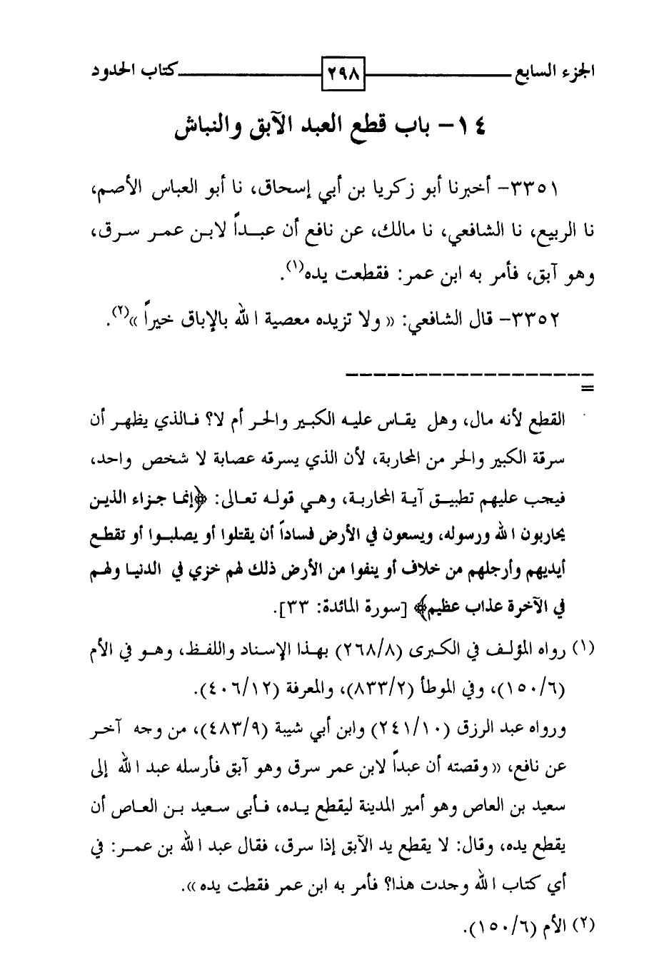 3351 - أخبرنا أبو زكريا بن أبي إسحاق ، نا أبو العباس الأصم ، نا الربيع ، نا الشافعي ، نا مالك ، عن نافع أن عبداً لابن عمر سرق ، وهو آبق ، فأمر به ابن عمر : فقطعت يده ( 1 ) .