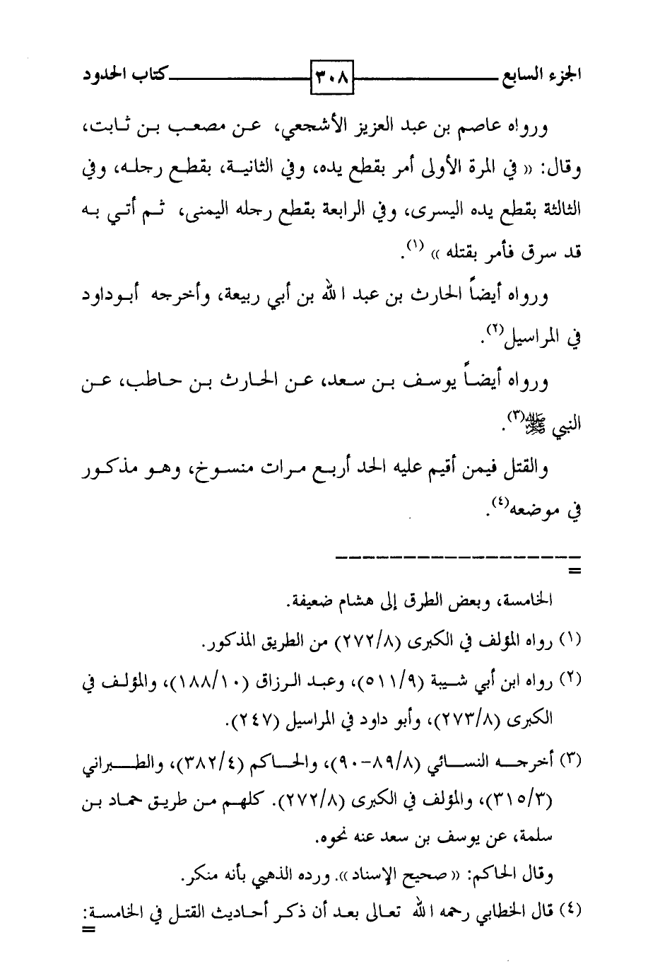 ورواه عاصم بن عبد العزيز الأشجعي ، عن مصعب بن ثابت ، وقال : ( ( في المرة الأولى أمر بقطع يده ، وفي الثانية ، بقطع رجله ، وفي الثالثة بقطع يده اليسرى ، وفي الرابعة بقطع رجله اليمنى ، ثم أتي به قد سرق فأمر بقتله ( 1 ) . ورواه أيضاً الحارث بن عبد الله بن أبي ربيعة ، وأخرجه أبو داود في المراسيل ( 2 ) . ورواه أيضاً يوسف بن سعد ، عن الحارث بن حاطب ، عن النبي صلى الله عليه وسلم ( 3 ) . والقتل فيمن أقيم عليه الحد أربع مرات منسوخ ، وهو مذكور في موضعه ( 4 ) .
