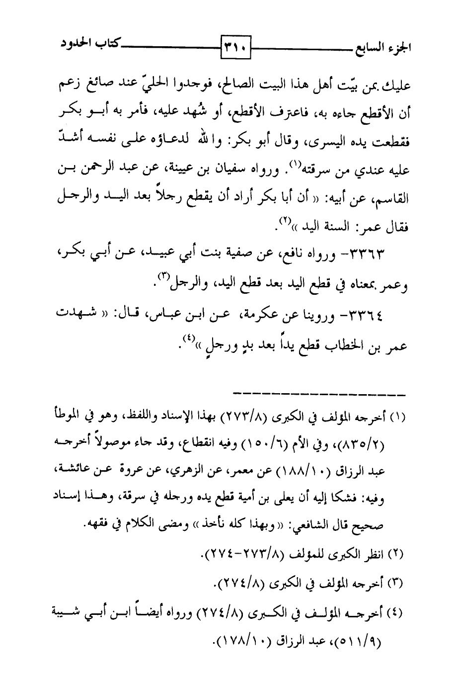 3363 - ورواه نافع ، عن صفية بنت أبي عبيد ، عن أبي بكر ، وعمر بمعناه في قطع اليد بعد قطع اليد ، والرجل ( 3 ) .
