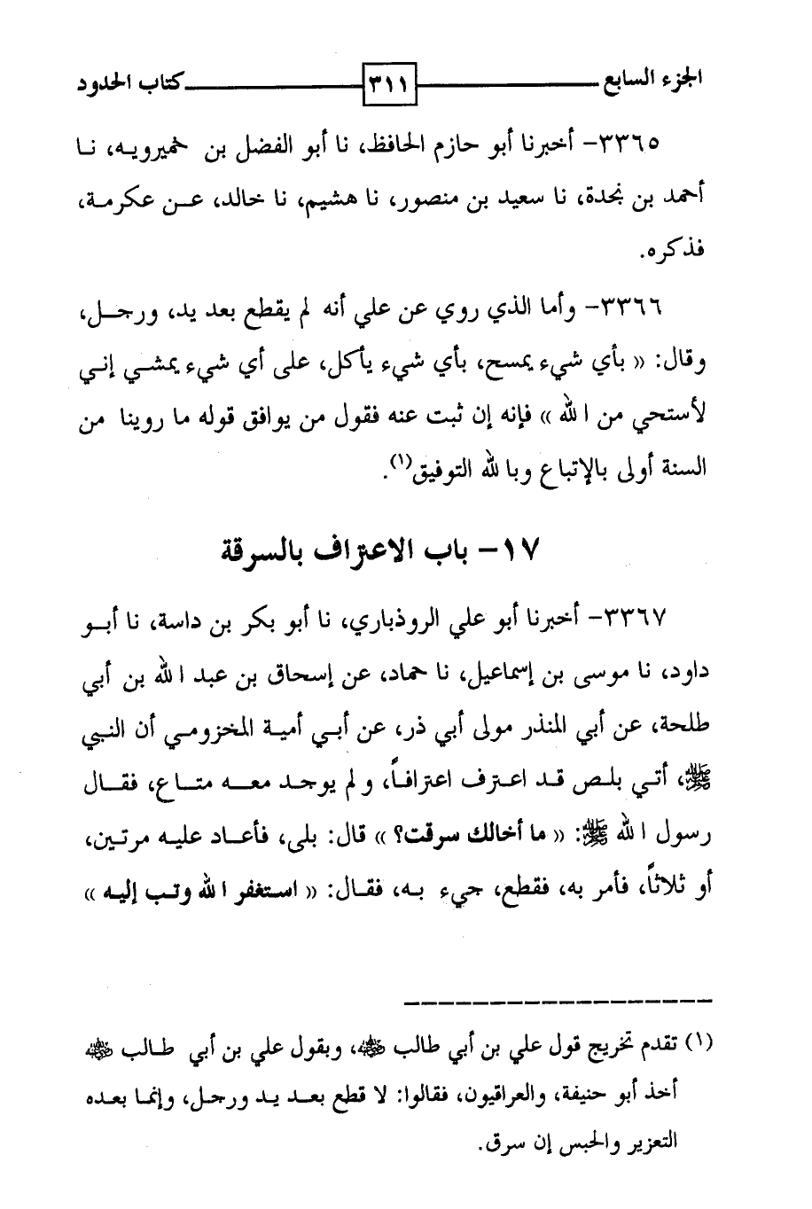 3366 - وأما الذي روي عن علي أنه لم يقطع بعد يد ، ورجل ، وقال : ( ( بأي شيء يمسح ، بأي شيء يأكل ، على أي شيء يمشي إني لأستحي من الله ) ) فإنه إن ثبت عنه فقول من يوافق قوله ما روينا من السنة أولى بالإتباع وبالله التوفيق ( 1 ) . 17 - باب الاعتراف بالسرقة