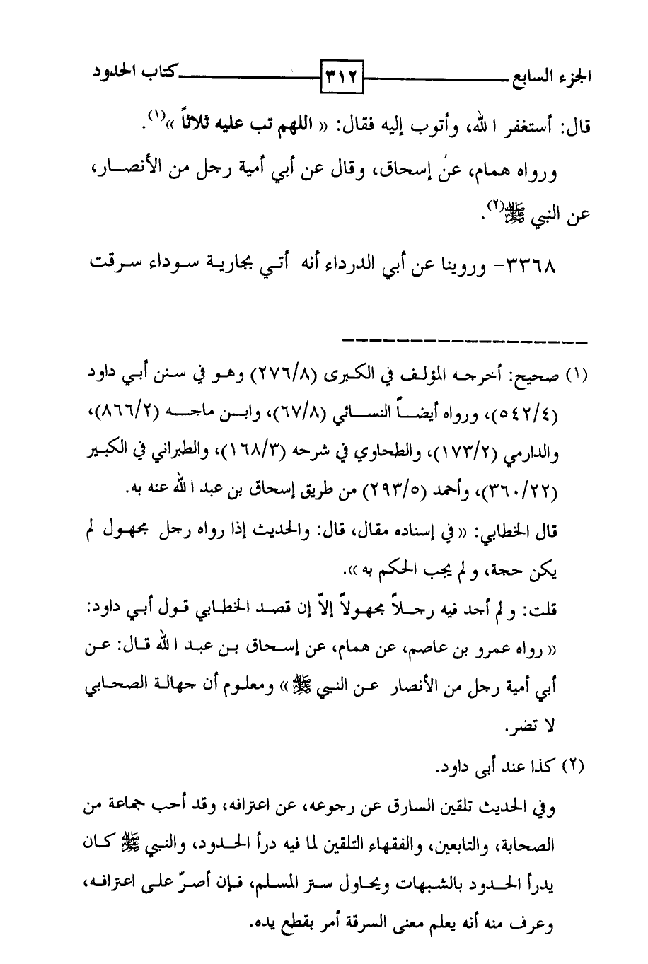 قال : أستغفر الله ، وأتوب إليه فقال : ( ( اللهم تب عليه ثلاثاً ) ) ( 1 ) . ورواه همام ، عن إسحاق ، وقال عن أبي أمية رجل من الأنصار ، عن النبي صلى الله عليه وسلم ( 2 ) .