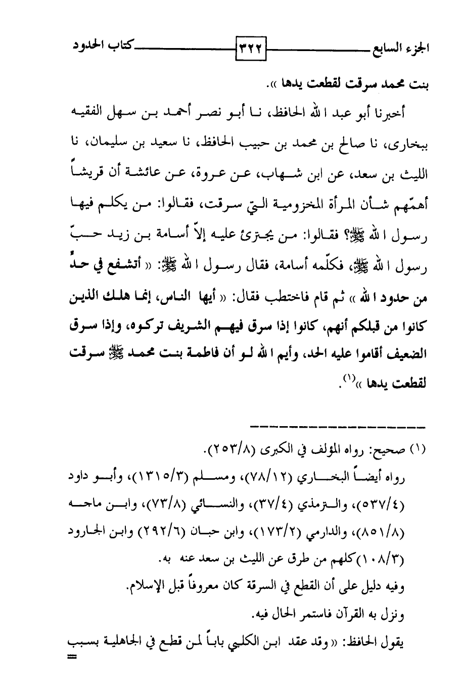 بنت محمد سرقت لقطعت يدها ) ) . أخبرنا أبو عبد الله الحافظ ، نا أبو نصر أحمد بن سهل الفقيه ببخارى ، نا صالح بن محمد بن حبيب الحافظ ، نا سعيد بن سليمان ، نا الليث بن سعد ، عن ابن شهاب ، عن عروة ، عن عائشة أن قريشاً أهمهم شأن المرأة المخزومية التي سرقت ، فقالوا : من يكلم فيها رسول الله صلى الله عليه وسلم ؟ فقالوا : من يجترئ عليه إلا أسامة بن زيد حب رسول الله صلى الله عليه وسلم ، فكلمه أسامة ، فقال رسول الله صلى الله عليه وسلم : ( ( أتشفع في حد من حدود الله ) ) ثم قام فاختطب فقال : ( ( أيها الناس ، إنما هلك الذين كانوا من قبلكم أنهم ، كانوا إذا سرق فيهم الشريف تركوه ، وإذا سرق الضعيف أقاموا عليه الحد ، وأيم الله لو أن فاطمة بنت محمد صلى الله عليه وسلم سرقت لقطعت يدها ) ) ( 1 ) .