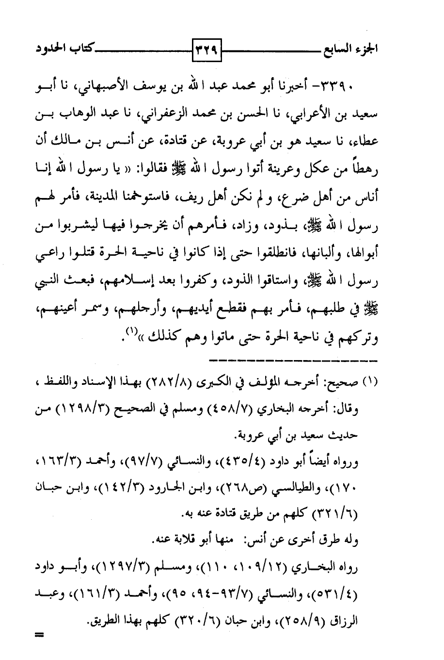 3390 - أخبرنا أبو محمد عبد الله بن يوسف الأصبهاني ، نا أبو سعيد بن الأعرابي ، نا الحسن بن محمد الزعفراني ، نا عبد الوهاب بن عطاء ، نا سعيد هو بن أبي عروبة ، عن قتادة ، عن أنس بن مالك أن رهطأ من عكل وعرينة أتوا رسول الله صلى الله عليه وسلم فقالوا : ( ( يا رسول الله إنا أناس من أهل ضرع ، ولم نكن أهل ريف ، فاستوخمنا المدينة ، فأمر لهم رسول الله صلى الله عليه وسلم ، بذود ، وزاد ، فأمرهم أن يخرجوا فيها ليشربوا من أبوالها ، وألبانها ، فانطلقوا حتى إذا كانوا في ناحية الحرة قتلوا راعي رسول الله صلى الله عليه وسلم ، واستاقوا الذود ، وكفروا بعد إسلامهم ، فبعث النبي صلى الله عليه وسلم في طلبهم ، فأمر بهم فقطع أيديهم ، وأرجلهم ، وسمر أعينهم ، وتركهم في ناحية الحرة حتى ماتوا وهو كذلك ) ) ( 1 ) .