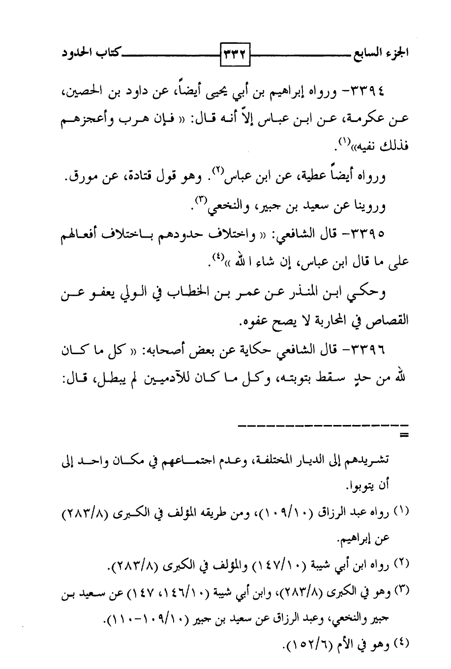 3395 - قال الشافعي : ( ( واختلاف حدودهم باختلاف أفعالهم على ما قال ابن عباس ، إن شاء الله ) ) ( 4 ) . وحكي ابن المنذر عن عمر بن الخطاب في الولي يعفو عن القصاص في المحاربة لا يصح عفوه .