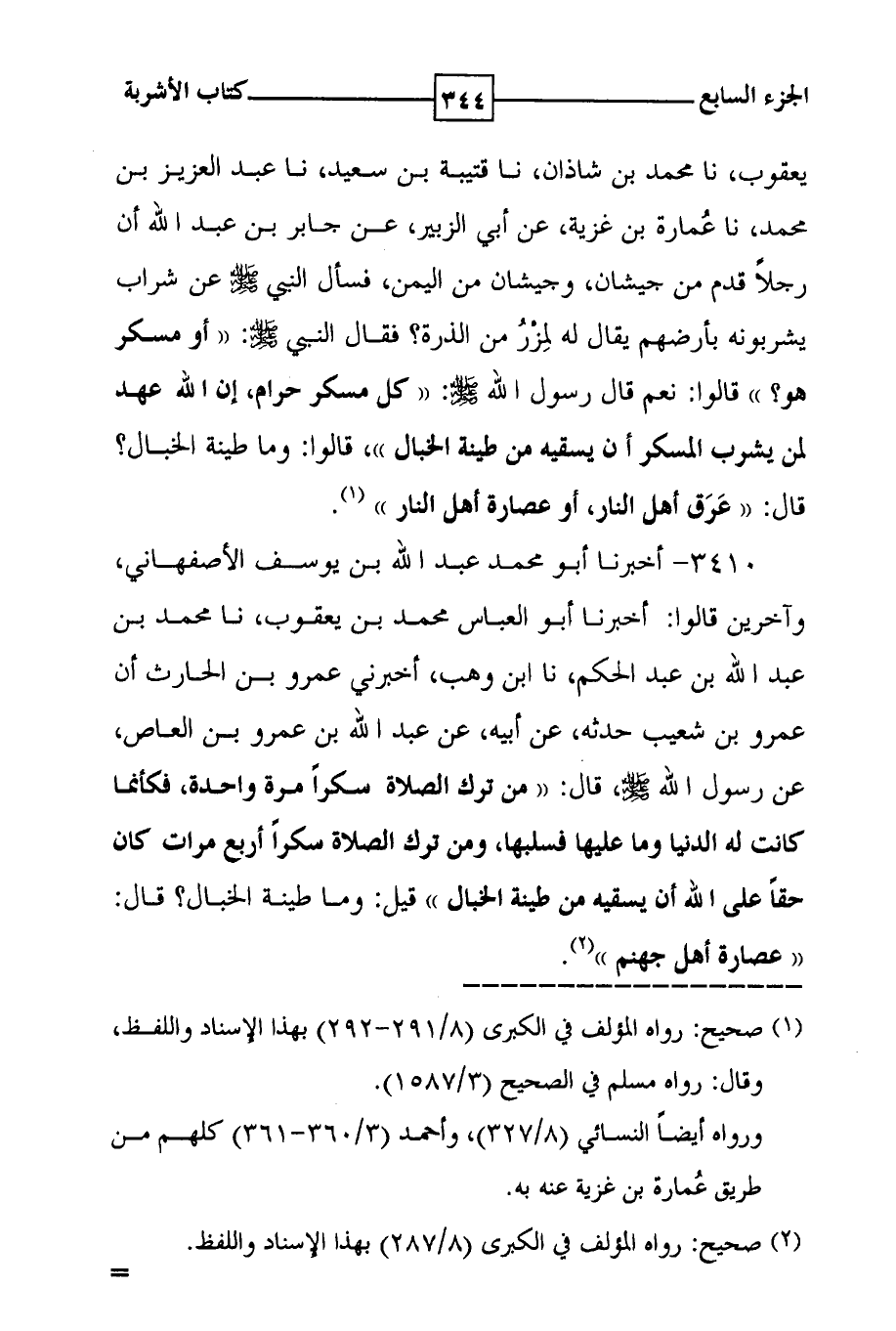 3410 - أخبرنا أبو محمد عبد الله بن يوسف الأصفهاني ، وآخرين قالوا : أخبرنا أبو العباس محمد بن يعقوب ، نا محمد بن عبد الله بن عبد الحكم ، نا ابن وهب ، أخبرني عمرو بن الحارث أن عمرو بن شعيب حدثه ، عن أبيه ، عن عبد الله بن عمرو بن العاص ، عن رسول الله صلى الله عليه وسلم ، قال : ( ( من ترك الصلاة سكراً مرة واحدة ، فكأنما كانت له الدنيا وما عليها فسلبها ، ومن ترك الصلاة سكراً أربع مرات كان حقاً على الله أن يسقيه من طينة الخبال ) ) قيل : وما طينة الخبال ؟ قال : ( ( عصارة أهل جهنم ) ) ( 2 ) . ( 1 ) صحيح : رواه المؤلف في الكبرى ( 8 / 291 - 292 ) بهذا الإسناد واللفظ ، ( 2 ) صحيح : رواه المؤلف في الكبرى ( 8 / 287 ) بهذا الإسناد واللفظ .