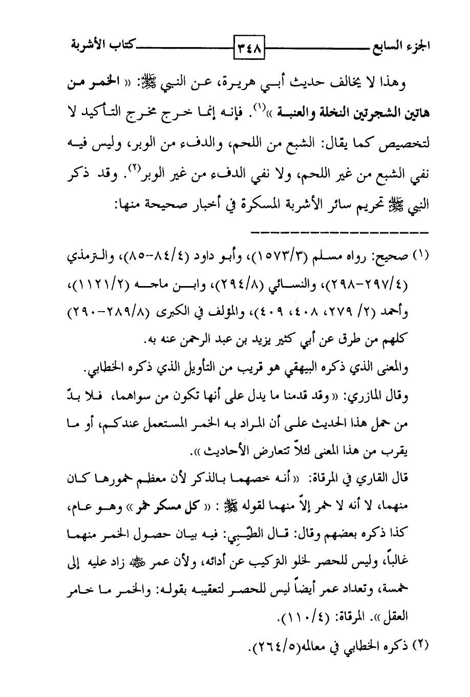 وهذا لا يخالف حديث أبي هريرة ، عن النبي صلى الله عليه وسلم : ( ( الخمر من هاتين الشجرتين النخلة والعنبة ) ) ( 1 ) . فإنه إنما خرج مخرج التأكيد لا لتخصيص كما يقال : الشبع من اللحم ، والدفء من الوبر ، وليس فيه نفي الشبع من غير اللحم ، ولا نفي الدفء من غير الوبر ( 2 ) . وقد ذكر النبي صلى الله عليه وسلم تحريم سائر الأشربة المسكرة في أخبار صحيحة منها :