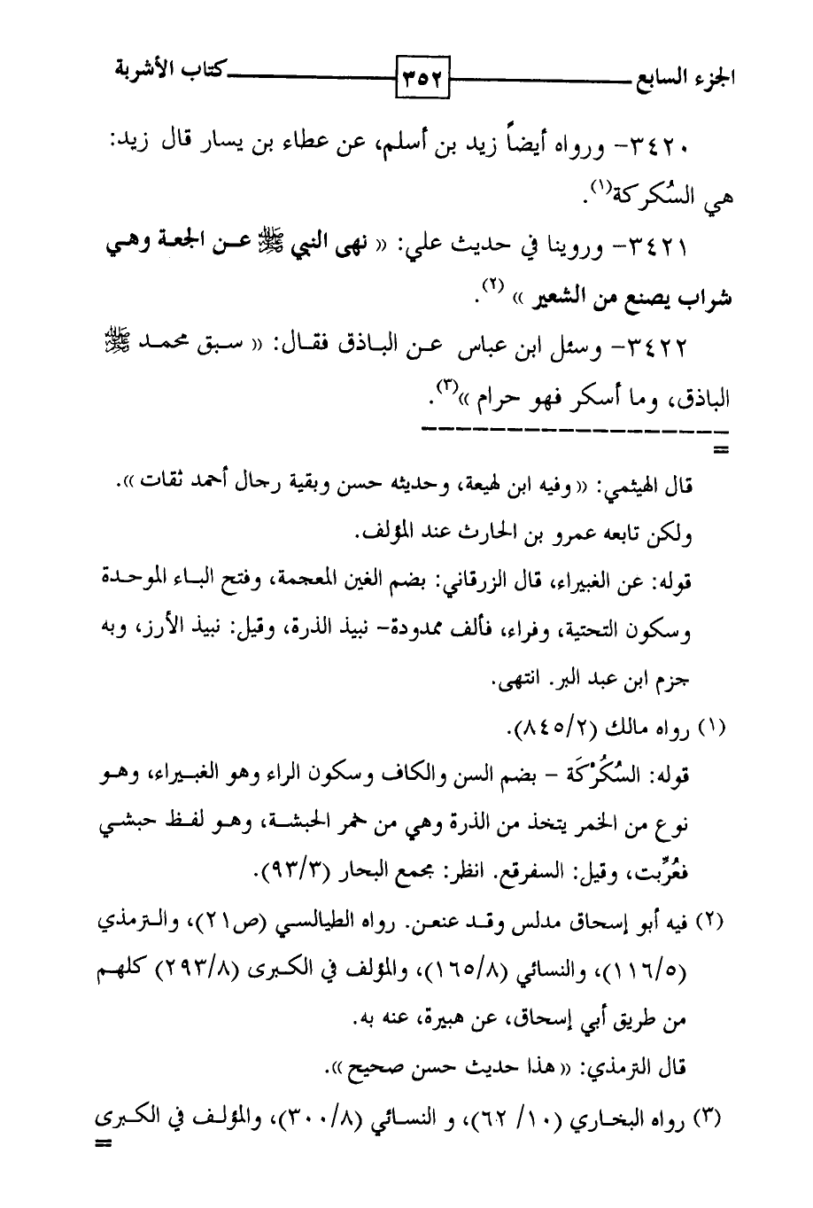 3420 - ورواه أيضاً زيد بن أسلم ، عن عطاء بن يسار قال : زيد : هي السكركة ( 1 ) . 3421 - وروينا في حديث علي : ( ( نهى النبي صلى الله عليه وسلم عن الجعة وهي شراب يصنع من الشعير ) ) ( 1 ) .