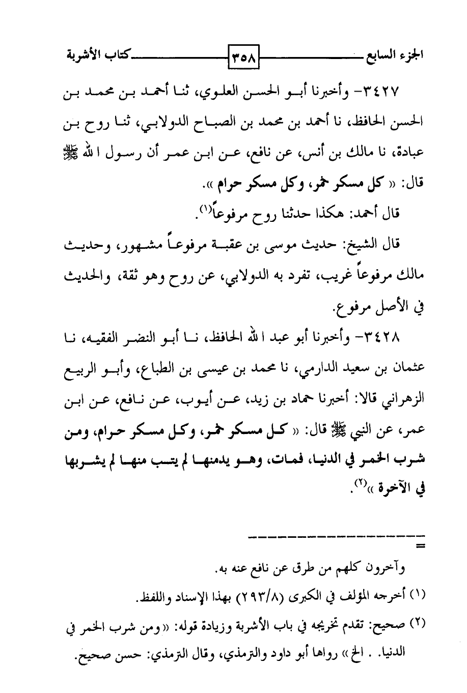 3428 - وأخبرنا أبو عبد الله الحافظ ، نا أبو النضر الفقيه ، نا عثمان بن سعيد الدارمي ، نا محمد بن عيسى بن الطباع ، وأبو الربيع الزهراني قالا : أخبرنا حماد بن زيد ، عن أيوب ، عن نافع ، عن ابن عمر ، عن النبي صلى الله عليه وسلم قال : ( ( كل مسكر خمر ، وكل مسكر حرام ، ومن شرب الخمر في الدنيا ، فمات ، وهو يدمنها لم يتب منها لم يشربها في الآخرة ) ) ( 2 ) .