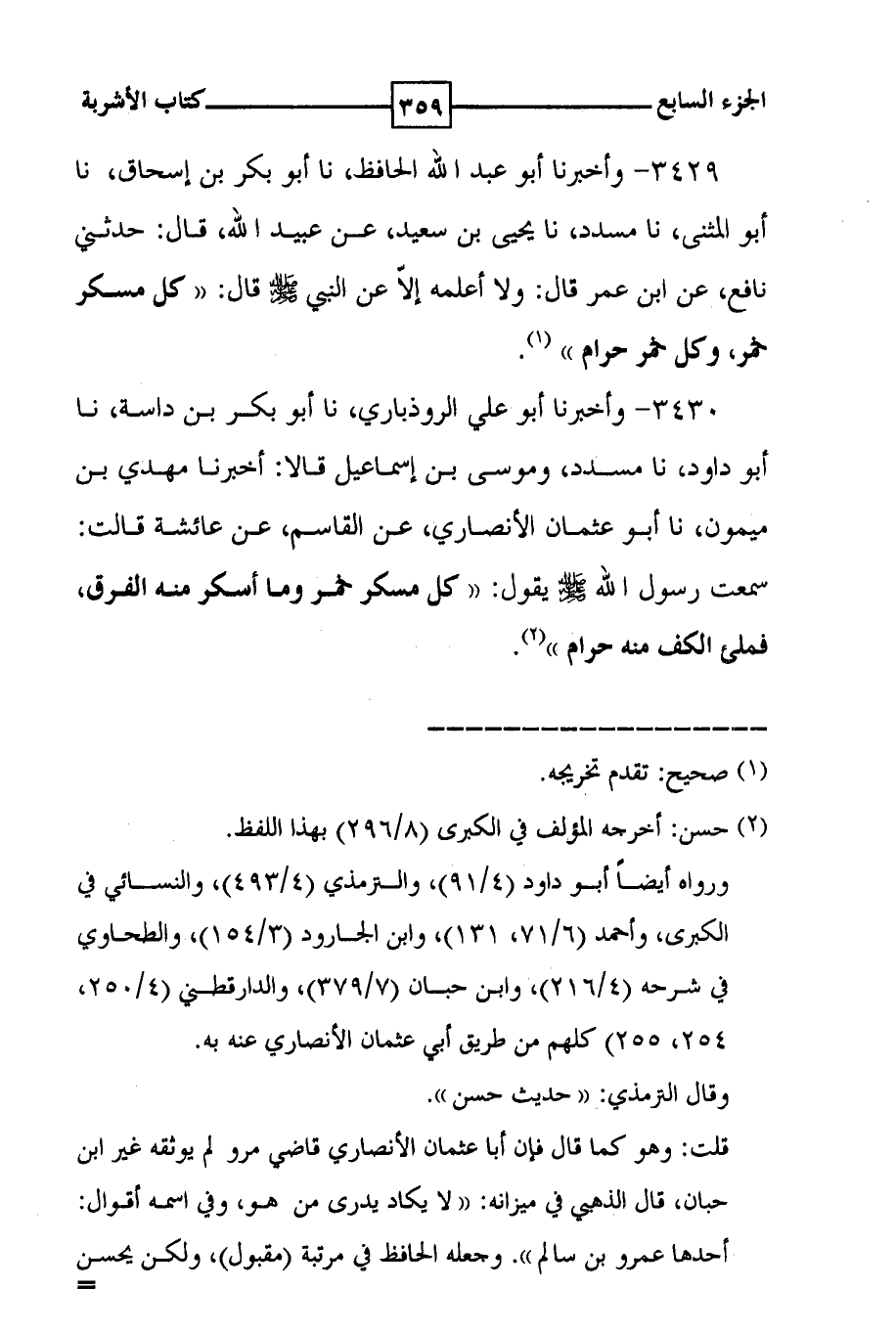 3430 - وأخبرنا أبو علي الروذباري ، نا أبو بكر بن داسة ، نا أبو داود ، نا مسدد وموسى بن إسماعيل قالا : أخبرنا مهدي بن ميمون ، نا أبو عثمان الأنصاري ، عن القاسم ، عن عائشة قالت : سمعت رسول الله صلى الله عليه وسلم يقول : ( ( كل مسكر خمر وما أسكر منه الفرق ، فملئ الكف منه حرام ) ) ( 2 ) .