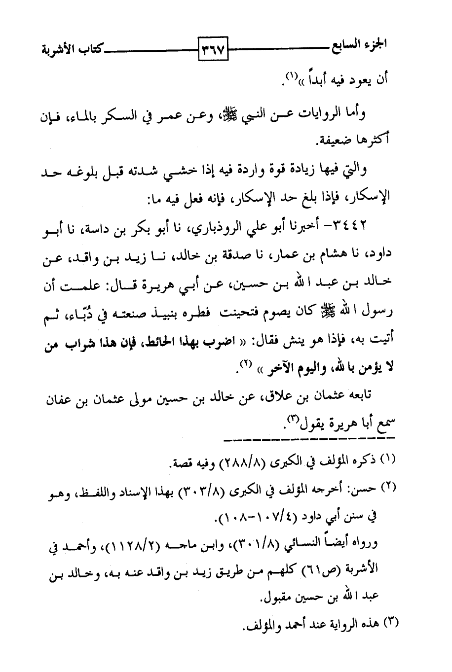3442 - أخبرنا أبو علي الروذباري ، نا أبو بكر بن داسة ، نا أبو داود ، نا هشام بن عمار ، نا صدقة بن خالد ، نا زيد بن واقد ، عن خالد بن عبد الله بن حسين ، عن أبي هريرة قال : علمت أن رسول الله صلى الله عليه وسلم كان يصوم فتحينت فطره بنبيذ صنعته في دباء ، ثم أتيت به ، فإذا هو ينش فقال : ( ( اضرب بهذا الحائط ، فإن هذا شراب من لا يؤمن بالله ، واليوم الآخر ) ) ( 2 ) . تابعه عثمان بن علاق ، عن خالد بن حسين مولى عثمان بن عفان سمع أبا هريرة يقول ( 3 ) .