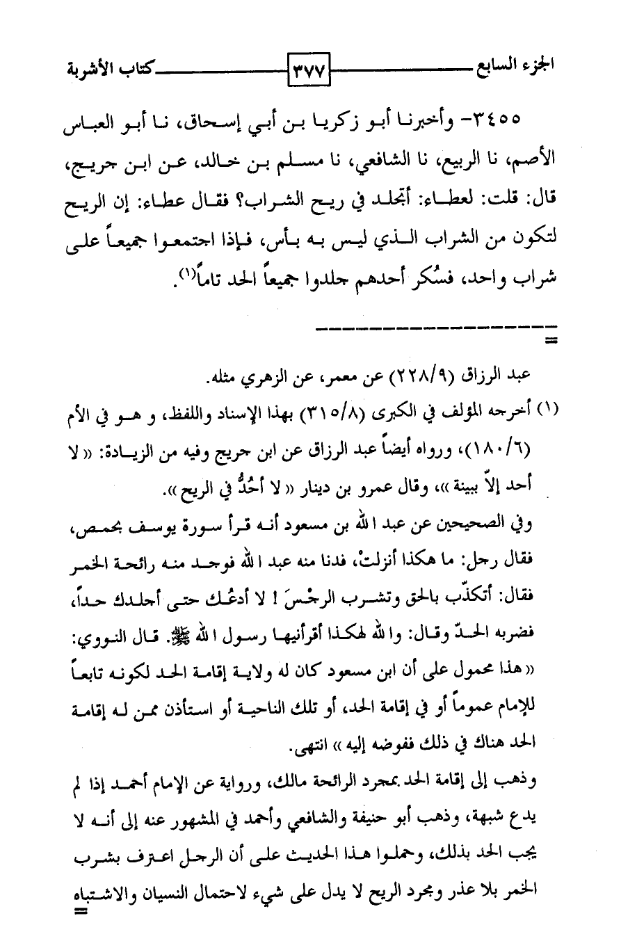 3455 - وأخبرنا أبو زكريا بن أبي إسحاق ، نا أبو العباس الأصم ، نا الربيع ، نا الشافعي ، نا مسلم بن خالد ، عن ابن جريج ، قال : قلت : لعطاء : أتجلد في ريح الشراب ؟ فقال عطاء : أن الريح لتكون من الشراب الذي ليس به بأس ، فإذا اجتمعوا جميعاً على شراب واحد ، فسكر أحدهم جلدوا جميعاً الحد تاماً ( 1 ) .