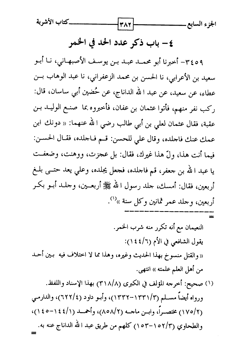 3459 - أخبرنا أبو محمد عبد بن يوسف الأصبهاني ، نا أبو سعيد بن الأعرابي ، نا الحسن بن محمد الزعفراني ، نا عبد الوهاب بن عطاء ، عن سعيد ، عن عبد الله الداناج ، عن حضين أبي ساسان ، قال : ركب نفر منهم ، فأتوا عثمان بن عفان ، فأخبروه بما صنع الوليد بن عقبة ، فقال عثمان لعلي بن أبي طالب رضي الله عنهما : ( ( دونك ابن عمك عنك فاجلده ، وقال علي للحسن : قم فاجلده ، فقال الحسن : فيما أنت هذا ، ول هذا غيرك ، فقال : بل عجزت ، ووهنت ، وضعفت يا عبد الله بن جعفر ، قم فاجلده ، فجعل يجلده ، وعلي يعد حتى بلغ أربعين ، فقال : أمسك ، جلد رسول الله صلى الله عليه وسلم أربعين ، وجلد أبو بكر أربعين ، وجلد عمر ثمانين وكل سنة ) ) ( 1 ) .