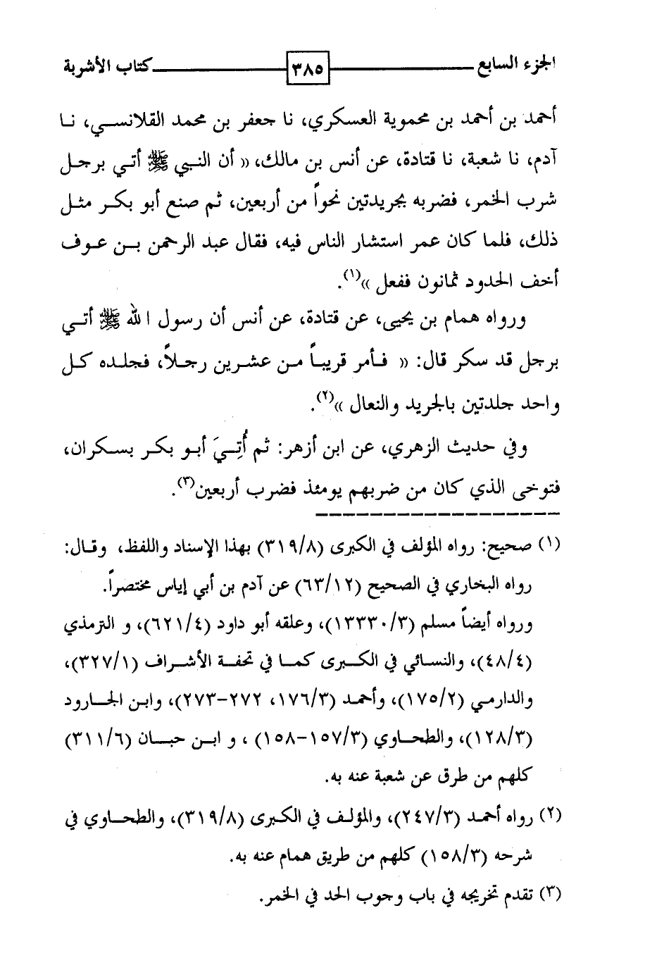 أحمد بن أحمد بن محموية العسكري ، نا جعفر بن محمد القلانسي ، نا آدم ، نا شعبة ، نا قتادة ، عن أنس بن مالك ، ( ( أن النبي صلى الله عليه وسلم أتي برجل شرب الخمر ، فضربه بجريدتين نحوا من أربعين ، ثم صنع أبو بكر مثل ذلك ، فلما كان عمر استشار الناس فيه ، فقال عبد الرحمن بن عوف أخف الحدود ثمانون ففعل ) ) ( 1 ) . ورواه همام بن يحيى ، عن قتادة ، عن أنس أن رسول الله صلى الله عليه وسلم أتي برجل قد سكر قال : ( ( فأمر قريباً من عشرين رجلاً فجلده كل واحد جلدتين بالجريد والنعال ) ) ( 2 ) . وفي حديث الزهري ، عن ابن أزهر : ثم أتي أبو بكر بسكران ، فتوخى الذي كان من ضربهم يومئذ فضرب أربعين ( 3 ) .